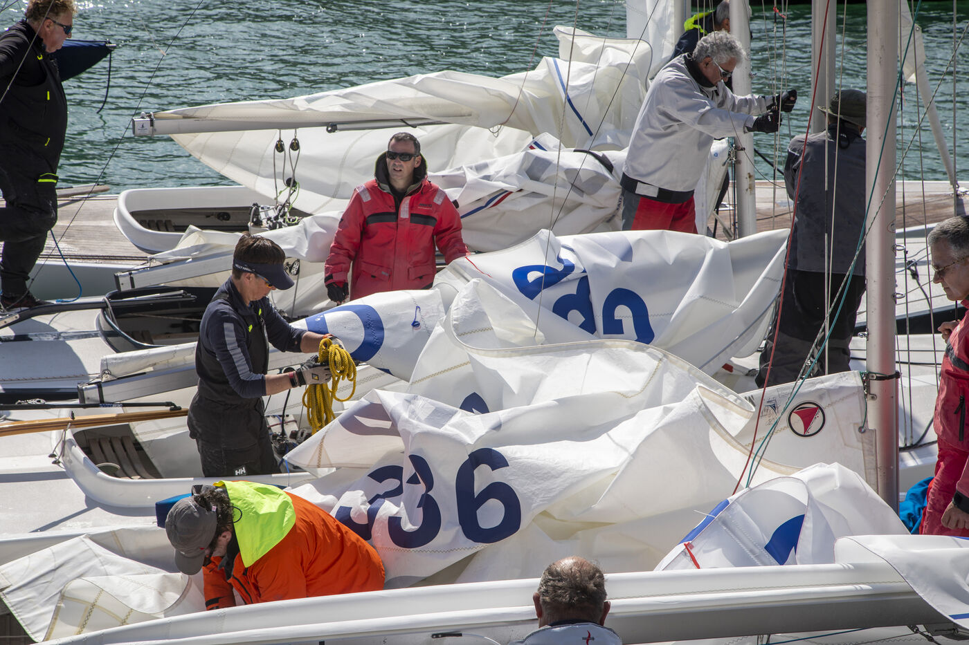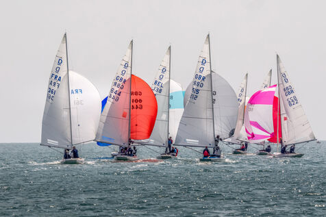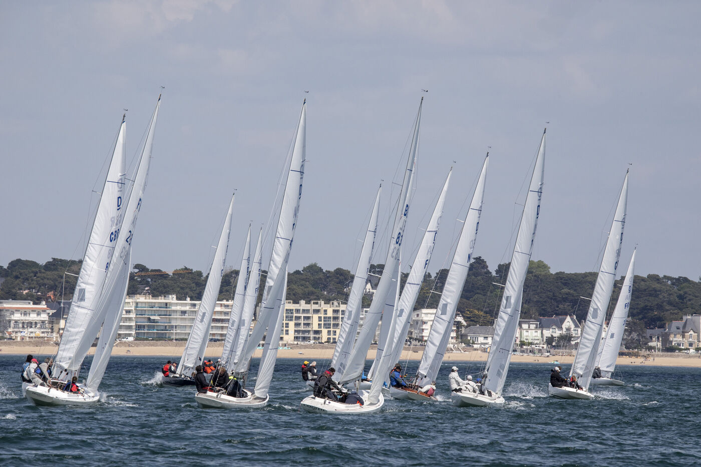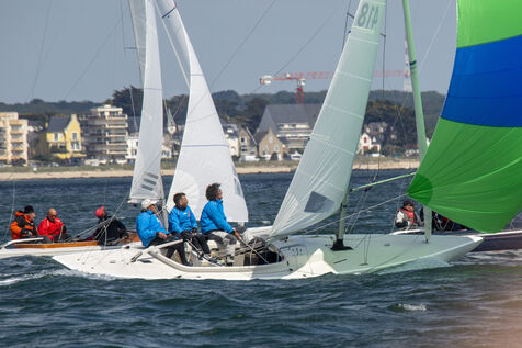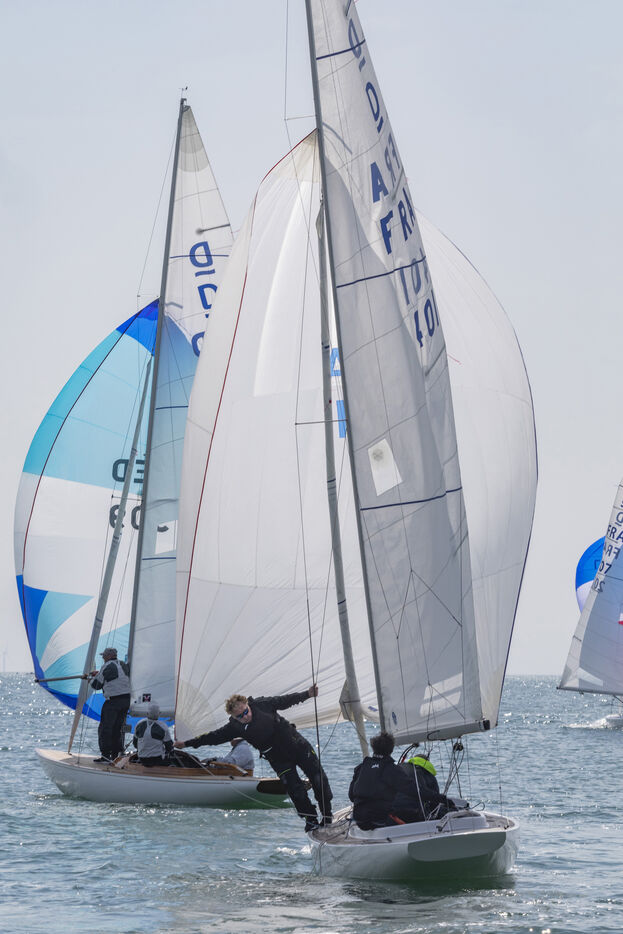 France, La Baule, 2023/05/17. Beginning of the International Dragon Derby of La Baule, organized by the Yacht-club of La Baule from May 17 to 20, 2023. Six nations are represented: twelve English boats, three Irish, four Dutch, three Belgians, one German and twelve French. At the end of the first day, the crew of Douanenez composed of Frédéric and Charlotte Gourlaouen and Jean-François Le Goff, is in the lead among the professionals. Photo by Caroline Paux / Hans Lucas.