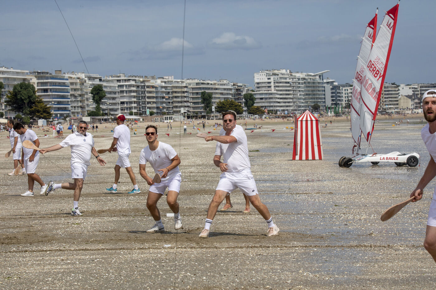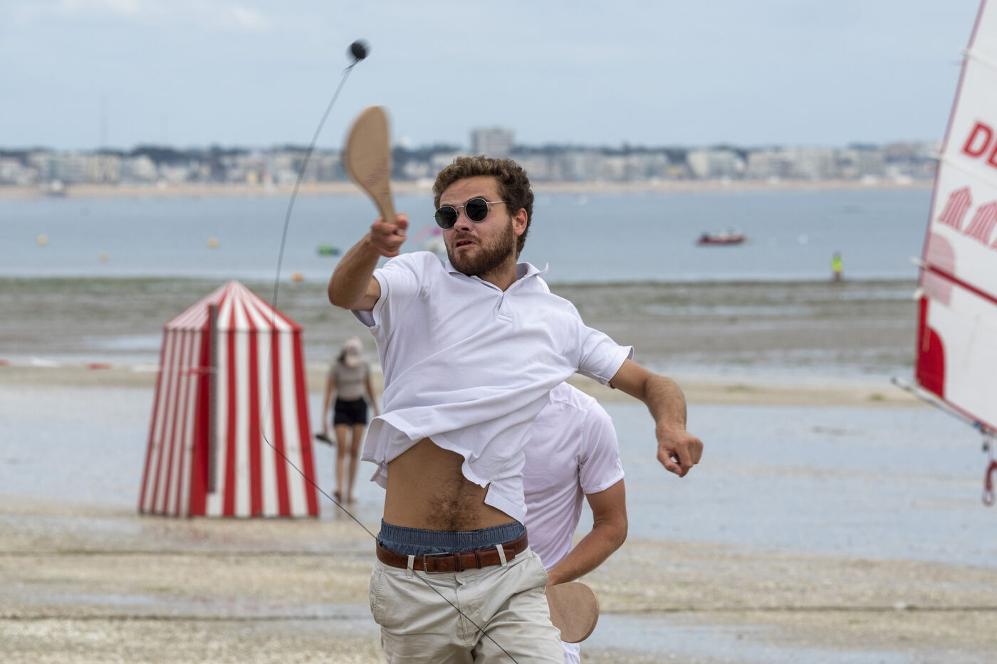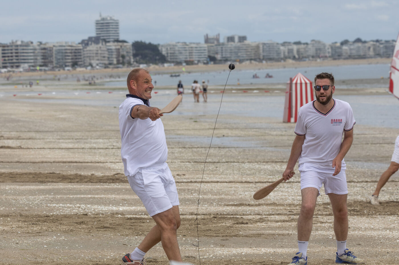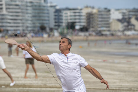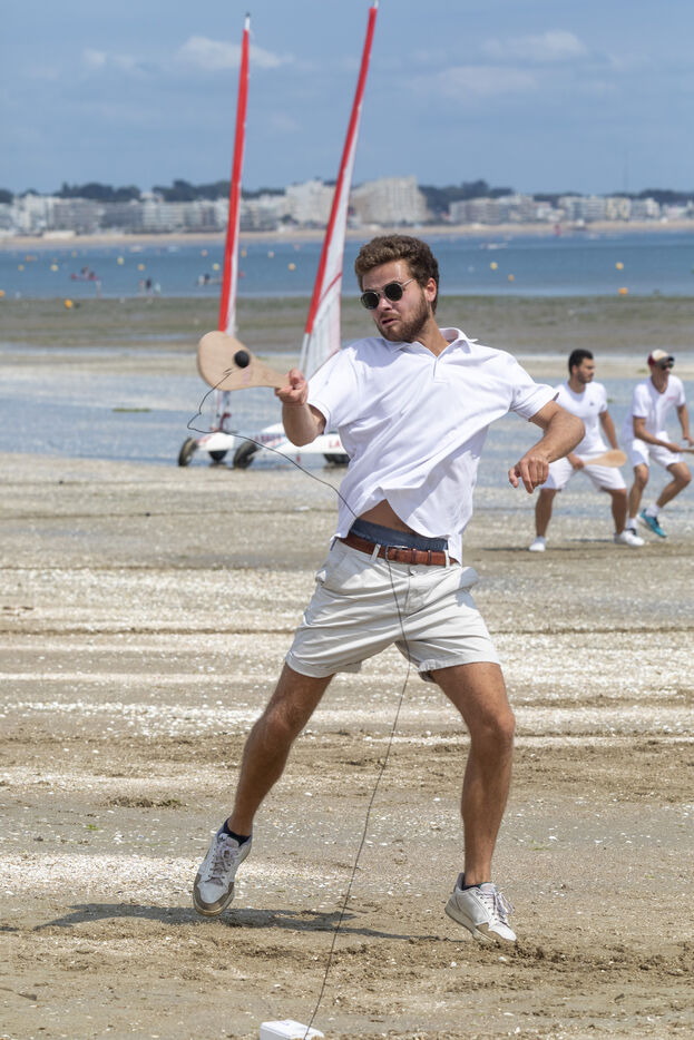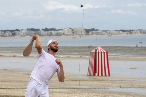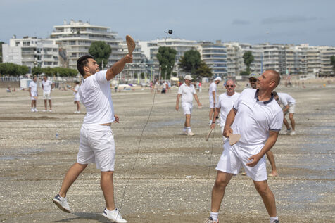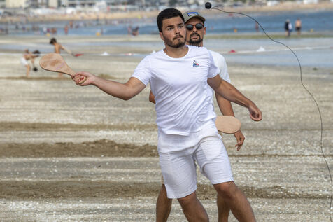France, La Baule, 2023-07-08. Maxime Brisson and Dylan Soalhat have created the Jokari Club, a movement to accelerate the development of Jokari and revive this iconic sport from the Basque country. A derby was organized on the beach at La Baule to show how this discipline, adapted for adults, is an attractive "urban beach sport" at a good level. The women's derby was won by Émilie Loit, a former professional tennis player, and the men's by Thomas Giraud. Photography by Caroline Paux / Hans Lucas.