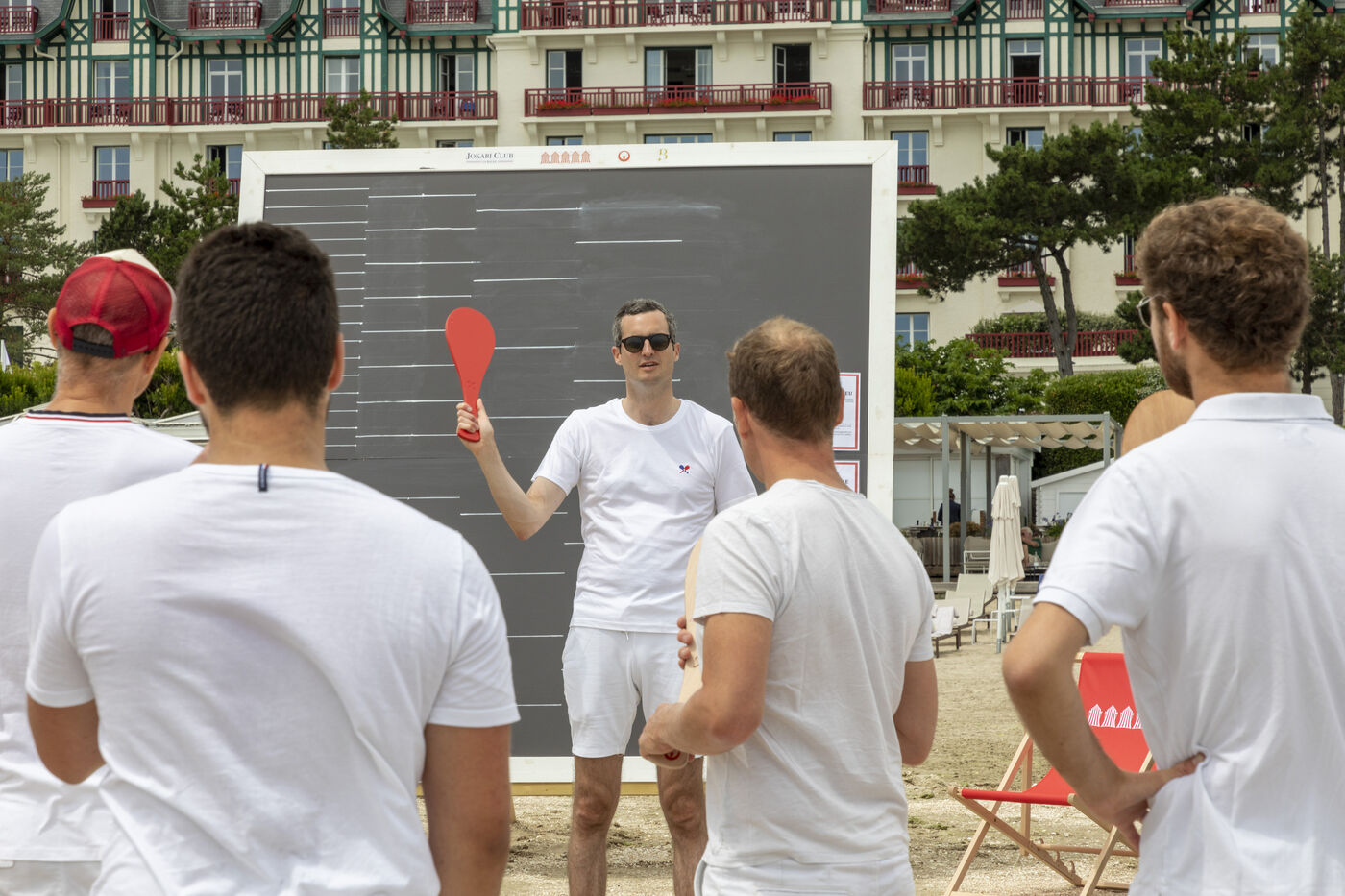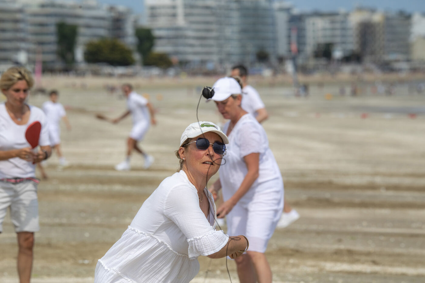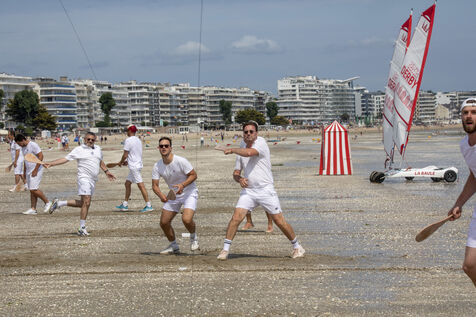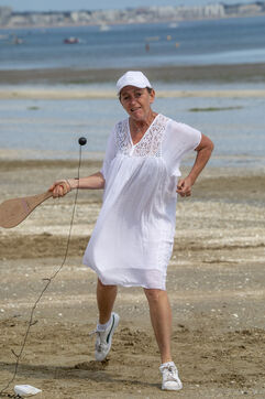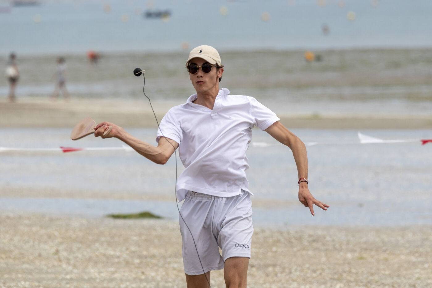 France, La Baule, 2023-07-08. Maxime Brisson and Dylan Soalhat have created the Jokari Club, a movement to accelerate the development of Jokari and revive this iconic sport from the Basque country. A derby was organized on the beach at La Baule to show how this discipline, adapted for adults, is an attractive "urban beach sport" at a good level. The women's derby was won by Émilie Loit, a former professional tennis player, and the men's by Thomas Giraud. Photography by Caroline Paux / Hans Lucas.