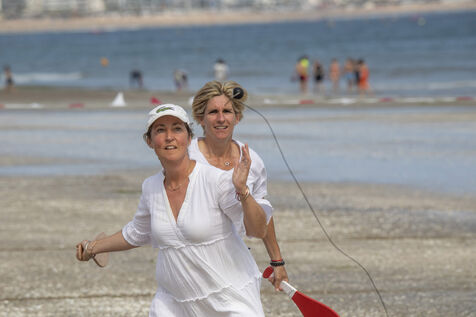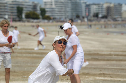 France, La Baule, 2023-07-08. Maxime Brisson et Dylan Soalhat ont créé le Jokari Club, un mouvement pour accélérer le développement du Jokari, faire renaître ce sport iconique venu du Pays basque. Un derby a été organisé sur la plage de La Baule pour montrer combien cette discipline, adaptée aux adultes, est un « sport de plage urbain » attractif et de bon niveau. Il a été remporté chez les femmes par Émilie Loit, ex-joueuse de tennis professionnelle, et chez les hommes, par Thomas Giraud. Photographie par Caroline Paux / Hans Lucas.
