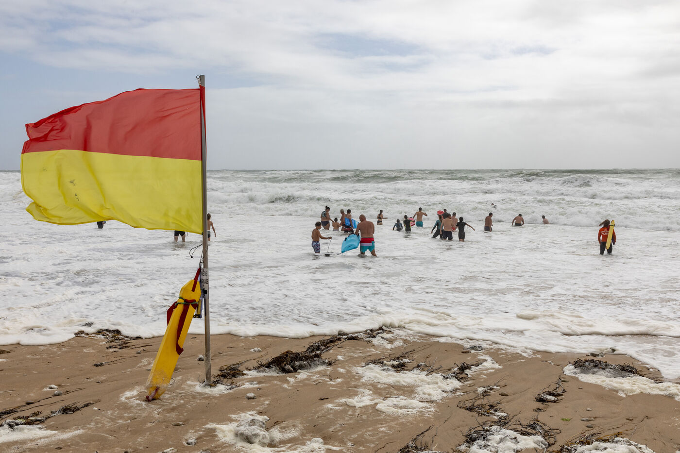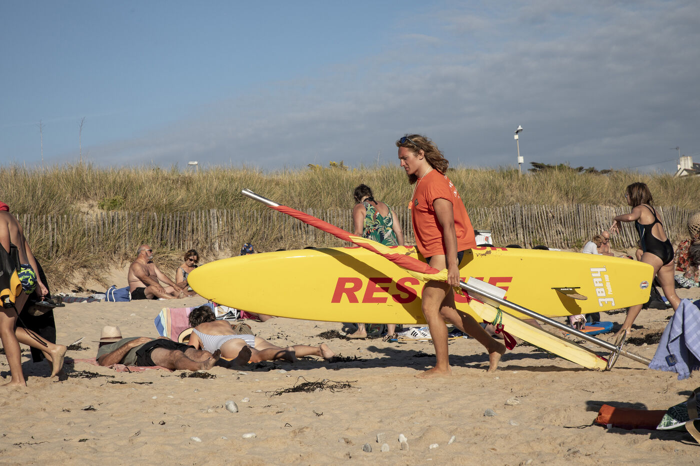France, Batz-sur-Mer, 2023-08-30. Chaque jour, des nageurs sauveteurs de la SNSM, premier maillon de la chaîne des secours sur le littoral, ont patrouillé tout l?été sur les plages de Batz-sur-Mer, en Loire-Atlantique. Ils ont joué un rôle préventif crucial en informant les baigneurs sur les conditions de la mer, les zones à risque, prêts à intervenir en cas de besoin. Leur présence rassurante incitait les estivants à adopter des comportements sécuritaires, comme éviter de s'aventurer trop loin dans l'océan ou de négliger les nouveaux drapeaux de signalisation. Photographie par Caroline Paux / Hans Lucas.