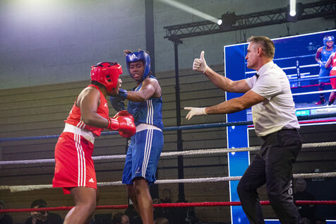 France, Deuil-La Barre, 16 décembre 2023. 22 combats de 3 rounds, organisés au complexe sportif Alain Mimoun de Deuil-la Barre, ont désigné les champions de France de boxe élites hommes et femmes dans les différentes catégories allant de 50 à +92 kg. Douze clubs français étaient représentés. Photographie par Caroline Paux / Hans Lucas.