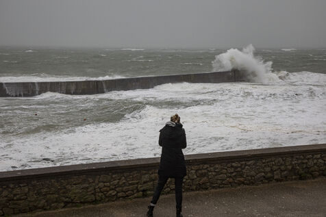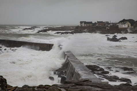 France, Batz-sur-Mer, 2 janvier 2024. Forte houle, pluie, vent fort, la côte Ouest subit différentes tempêtes, comme en Loire-Atlantique, placée en vigilance orange et notamment à Batz-sur-Mer et au Croisic. Photographie par Caroline Paux/Hans Lucas.