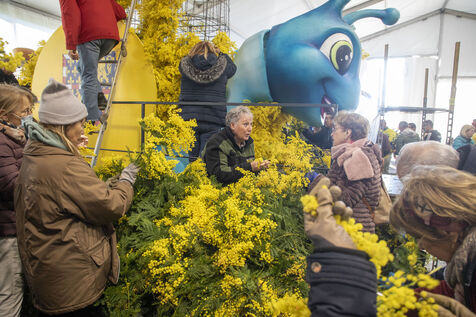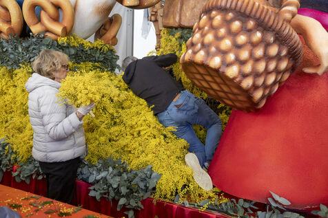 500 bénévoles ont préparé les douze chars du Corso fleuri en les couvrant de mimosa fraichement cueillis, à Mandelieu-la-Napoule, France, samedi 15 février 2025. Les chars ont participé a une parade nocturne le soir même et au grand corso et la bataille fleurie le lendemain près du port de Mandelieu devant plus de 45 000 spectateurs. Photographie par Caroline Paux / Hans Lucas