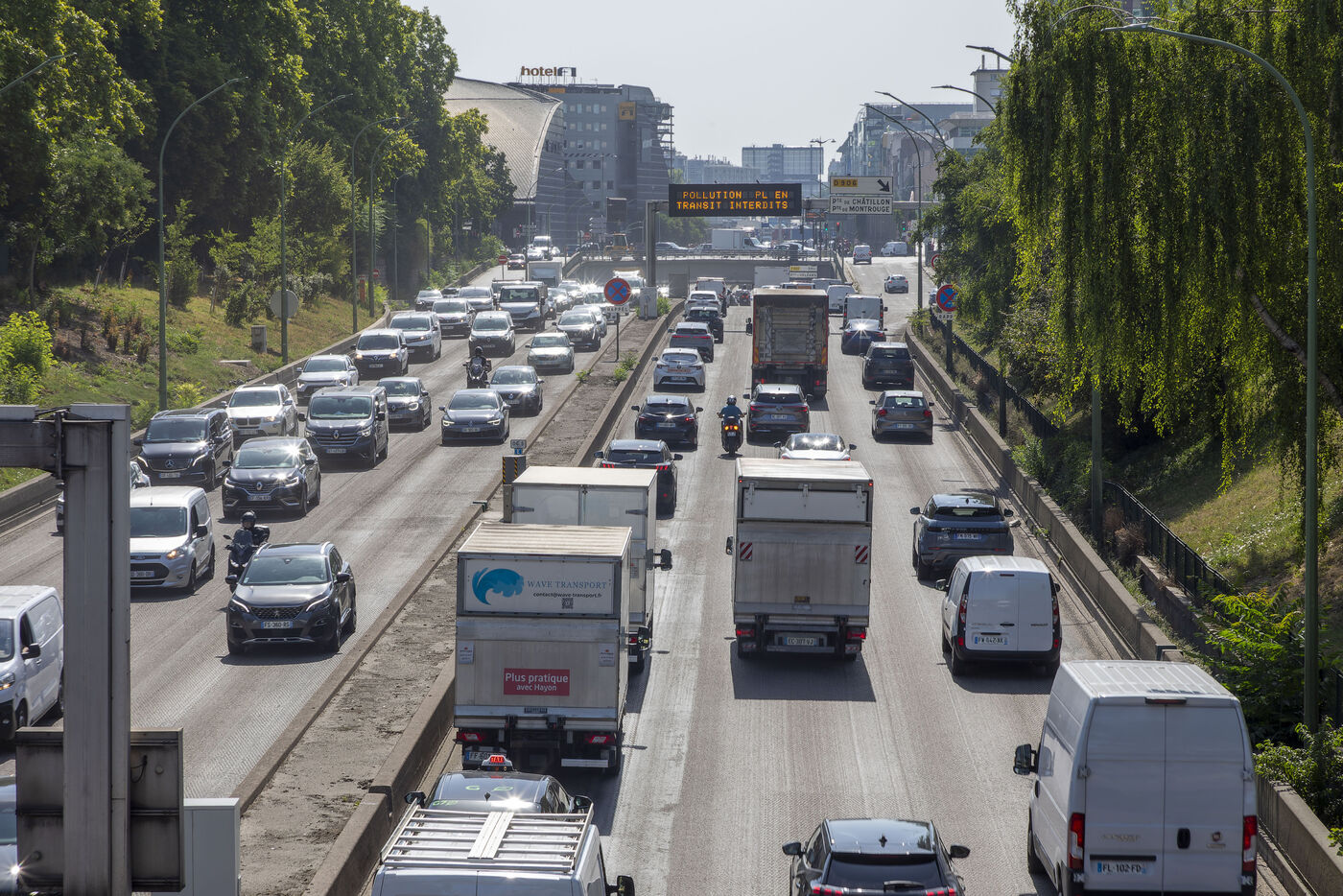 Very heavy traffic and a ban on heavy goods vehicles in transit due to pollution on the Paris ring road in France on 2 July 2025. Due to the heatwave and heavy ozone pollution in the Ile-de-France region, traffic restrictions have been imposed by the Paris Prefecture. Photography par Caroline Paux / Hans Lucas