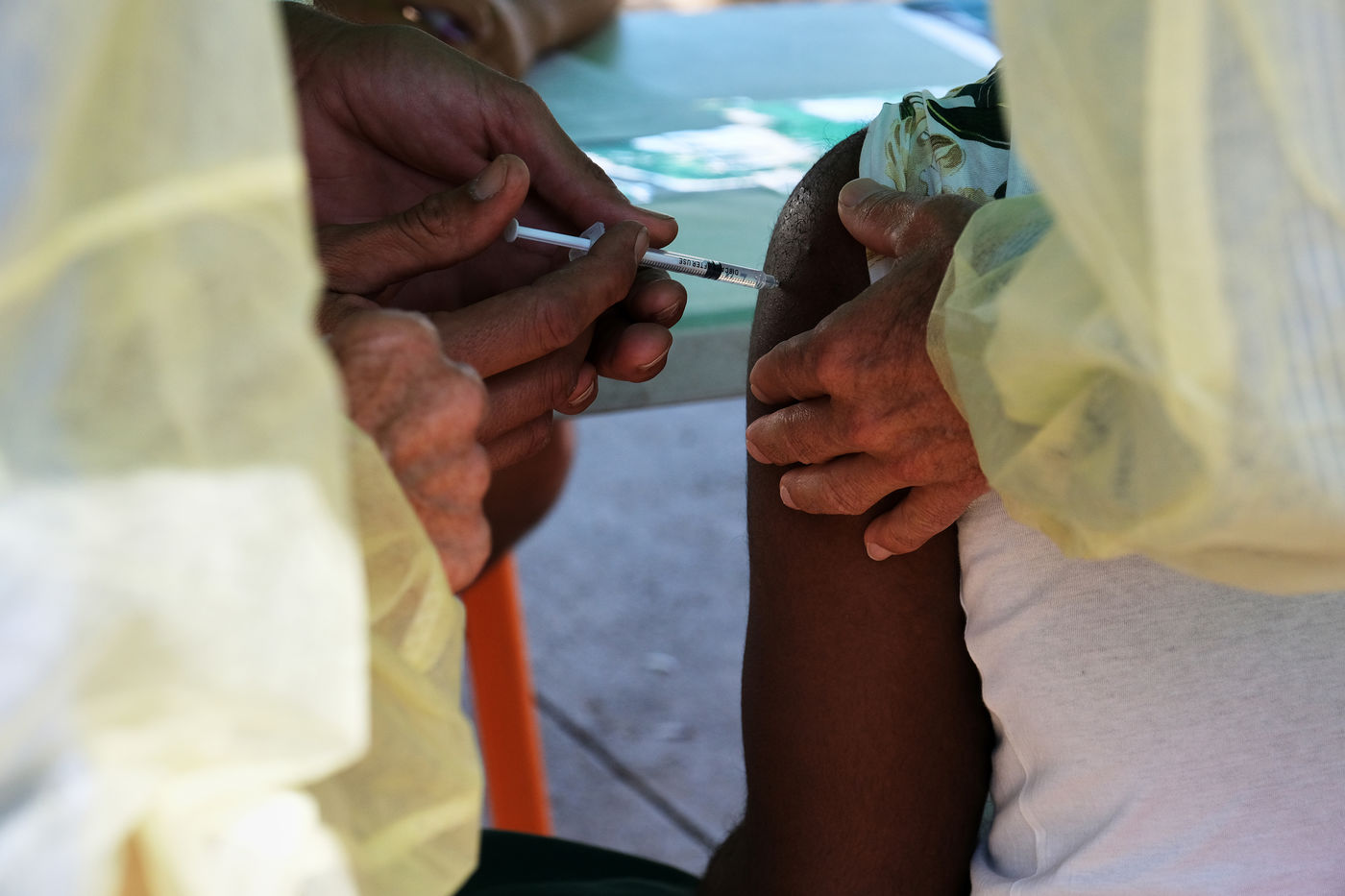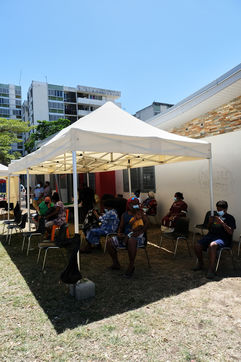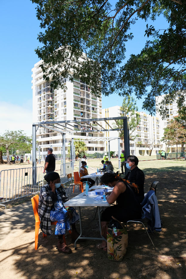 Nouméa, Nouvelle-Calédonie, 2021-09-24. Un centre de vaccination contre la COVID-19 est mis en place aux abords des Tours Magenta au nord-est de la ville de Nouméa. Depuis quelques semaines la Nouvelle-Calédonie a perdu son statut de covid-free et le virus progresse rapidement à travers le territoire. Le gouvernement de la Nouvelle-Calédonie a mis en place une campagne de vaccination intense, dans les villes et en brousse, pour qu'un maximum de personnes se vaccinent contre la Covid-19.