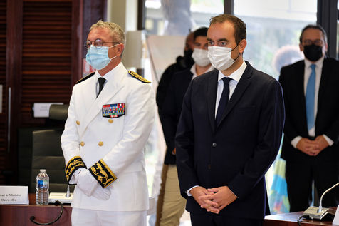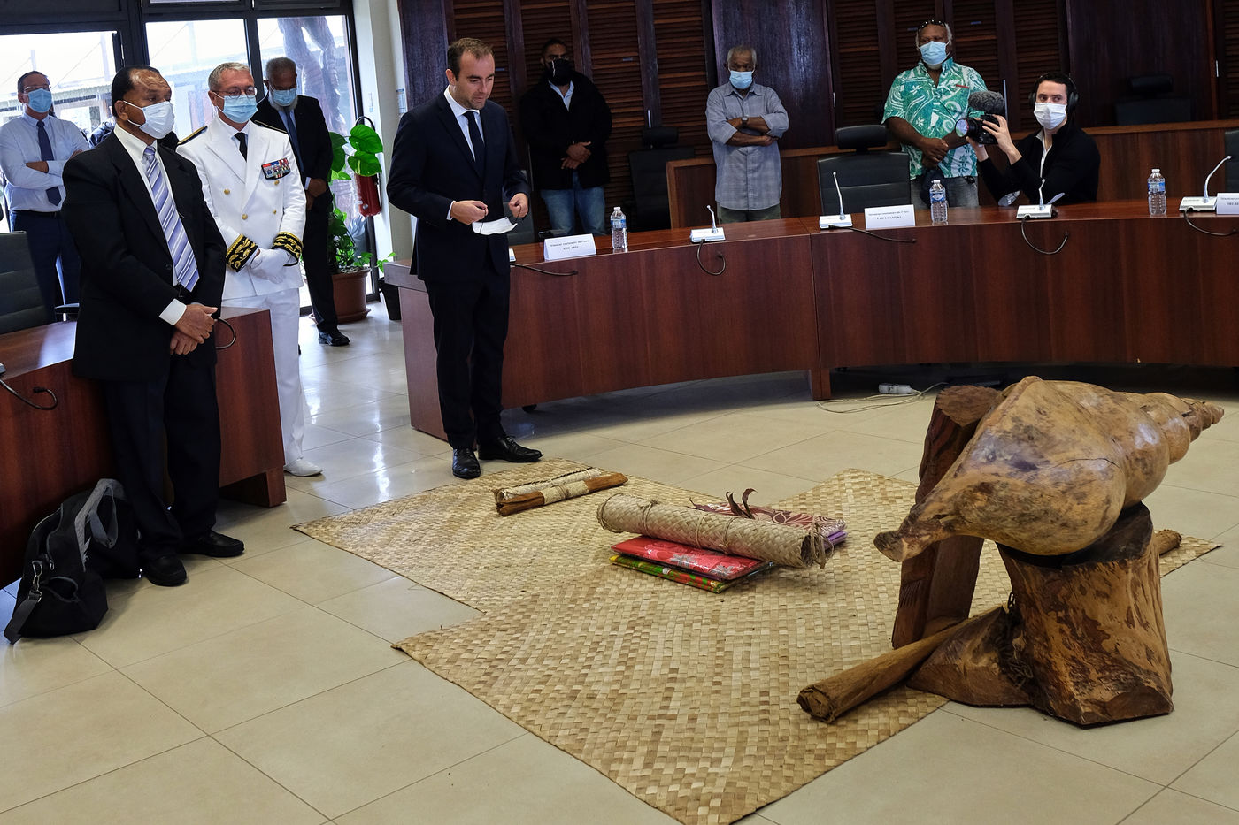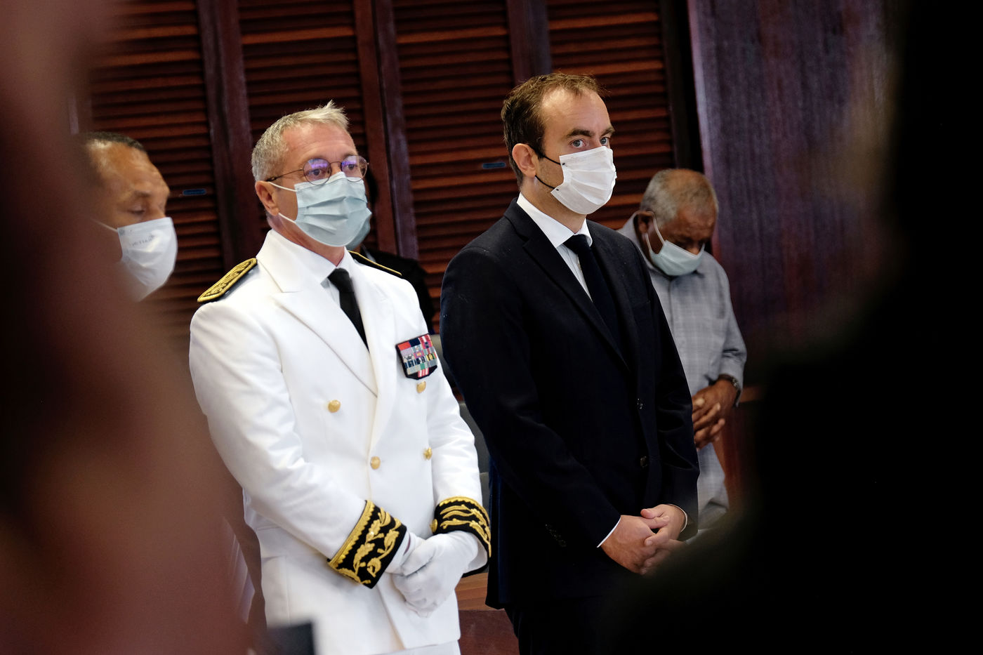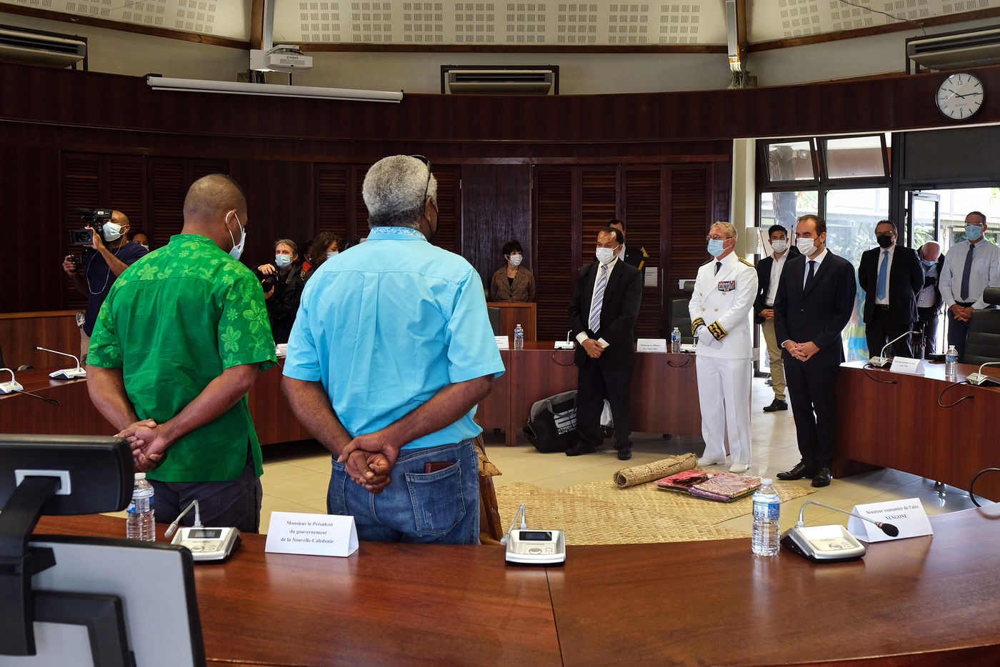 Le Ministre des Outre-Mer Sébastien Lecornu est en visite d'Etat en Nouvelle-Calédonie pour faire le point sur la crise sanitaire dûe à la pandémie de COVID-19 et anticiper l'organisation du 3ème référendum d'autodétermination du territoire qui aura lieu le 12 Décembre. Lors de son premier jour de visite officielle le Ministre s'est d'abord rendu au Sénat Coutumier pour effectuer une Coutume, signe de respect, d'humilité et de bienvenue en présence notamment de Yvon Kona, Président du Sénat Coutumier et de Patrice Faure, Haut-Commissaire de laRépublique en Nouvelle-Calédonie.