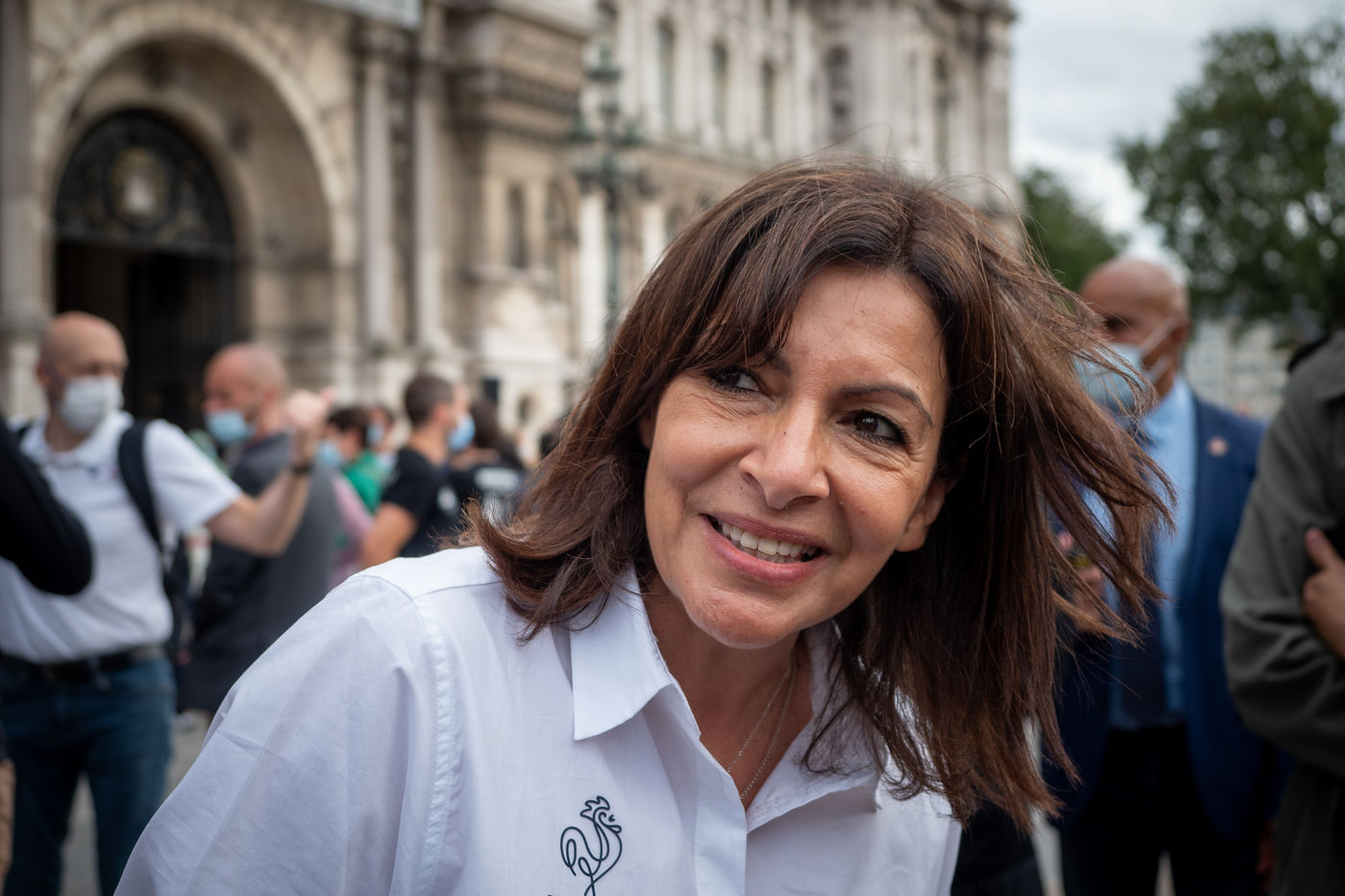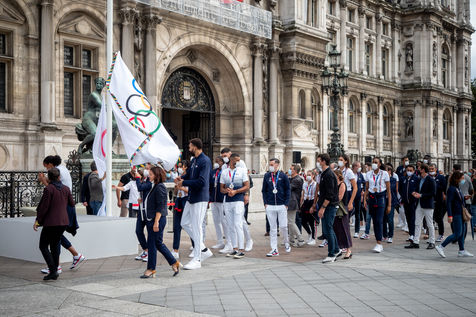 The French Olympic delegation back from Tokyo with the Mayor of Paris Annne Hidalgo, raises the Olympic flag for Paris2024.