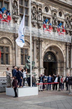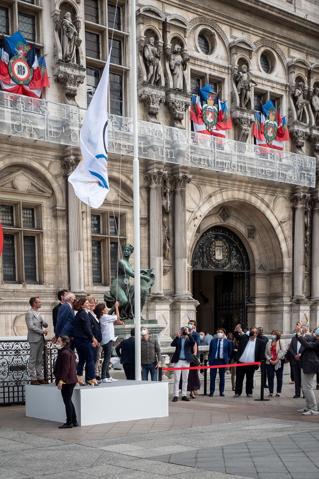 La délégation olympique française de retour de Tokyo avec la Maire de Paris Annne Hidalgo, hisse le drapeau olympique pour Paris2024.