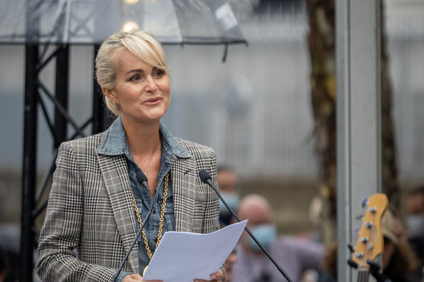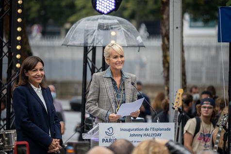 Anne Hidalgo, Mayor of Paris, and Laeticia Hallyday inaugurated the esplanade that bears the name of the singer in front of the Accor Arena in the 12th arrondissement of Paris. The sculpture of Bertrand Lavier entitled Something of..., 6 meters high represents Johnny in a figurative way with a blue granito on the ground as on the walk of fame of Hollywood, a mast representing a guitar neck and a Harley Davidson on top of it.