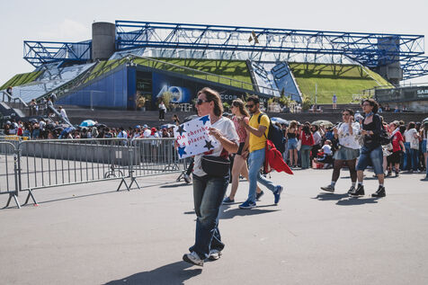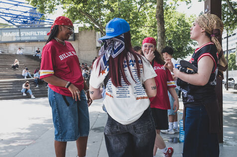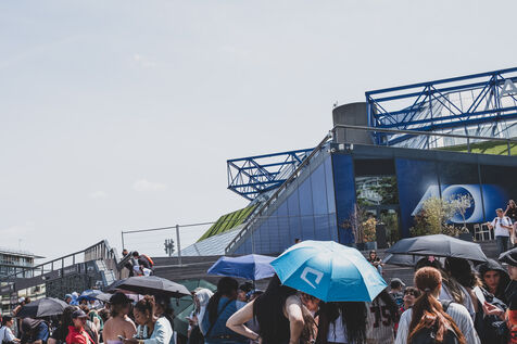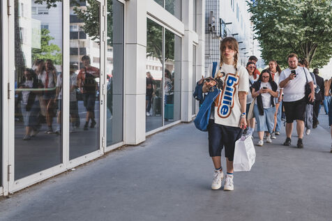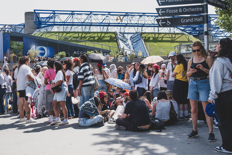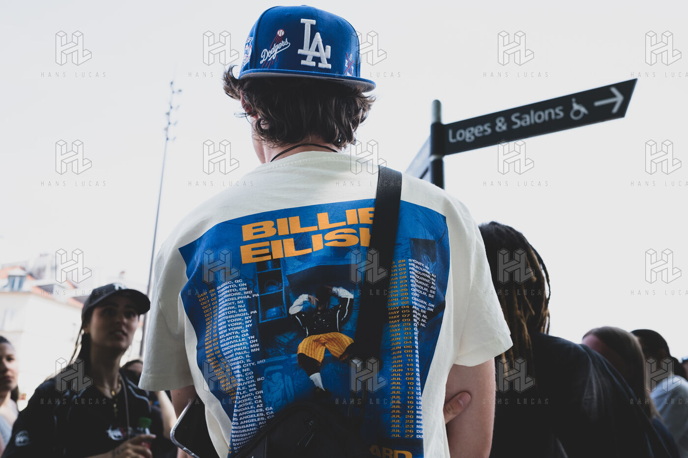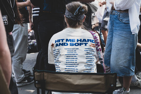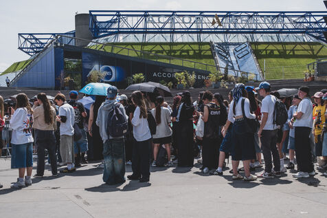 Illustration of Billie Eilish fans gathered in front of the Accor Arena Bercy in Paris on June 11, 2025, prior to her concert. Outfits inspired by or bearing the artist's likeness await one of the biggest musical events of the year.