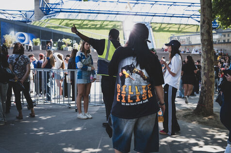 Illustration des fans de Billie Eilish rassemblés devant l’Accor Arena Bercy à Paris le 11 juin 2025 avant son concert. Tenues inspirées de l’artiste ou a son effigie attendent l’un des plus grands événements musicaux de l’année.