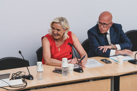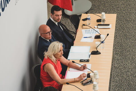 Agreement of the National Union, Rassemblement National and Union des Droites with Marine Le Pen, Jordan Bardella and Eric Ciotti at the National Assembly.