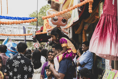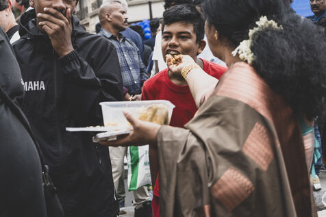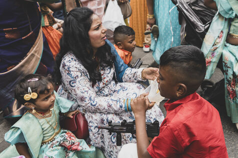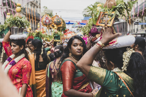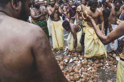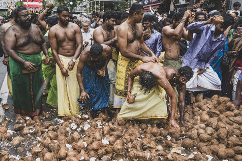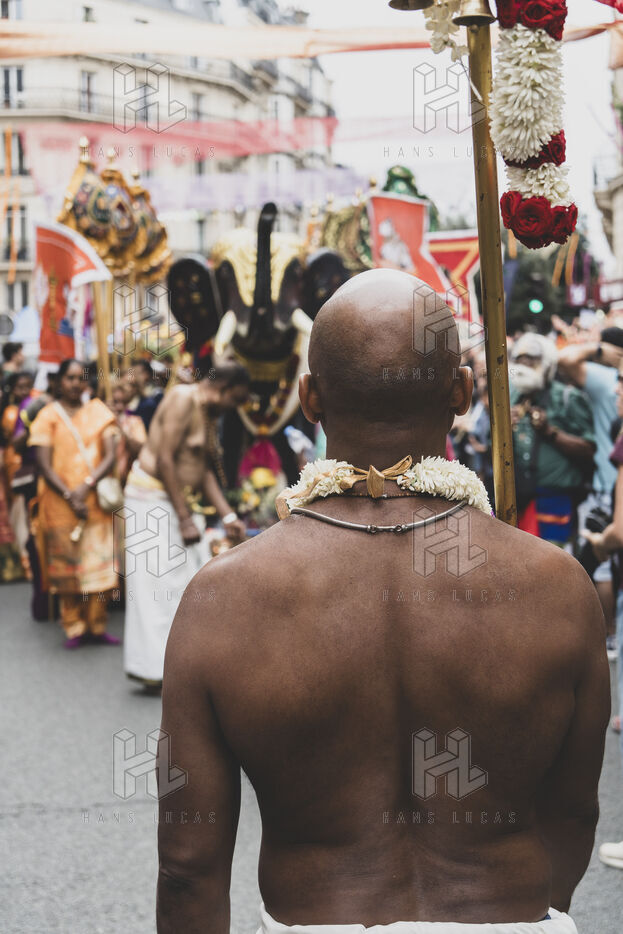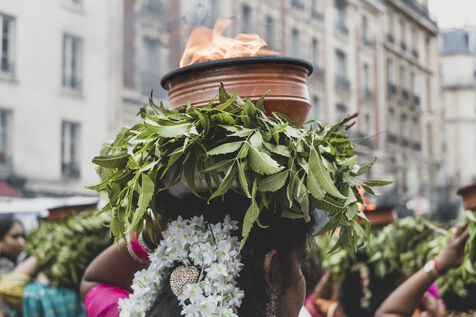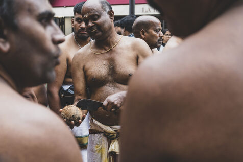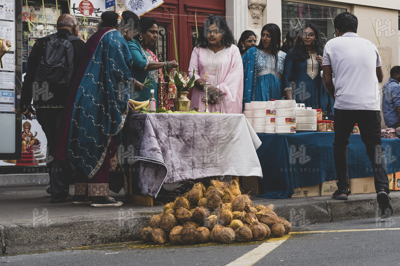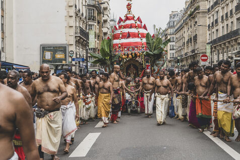 It is around the Sri Manicka Vinayakar Alayam temple located in the 18th arrondissement of Paris, that Ganesh is celebrated every year in the capital. During this day of celebration, religious ceremonies and a procession take place in the streets of the neighborhood. During this religious parade, coconuts are broken: the shell represents the illusion of the world, the flesh represents individual karma, and the coconut water represents the ego. This water is poured as the representation of Ganesha passes by. Next come the dancers, who carry large peacock feather arches called kavadi on their shoulders, and the female dancers, who carry terracotta pots with burning camphor on their heads.