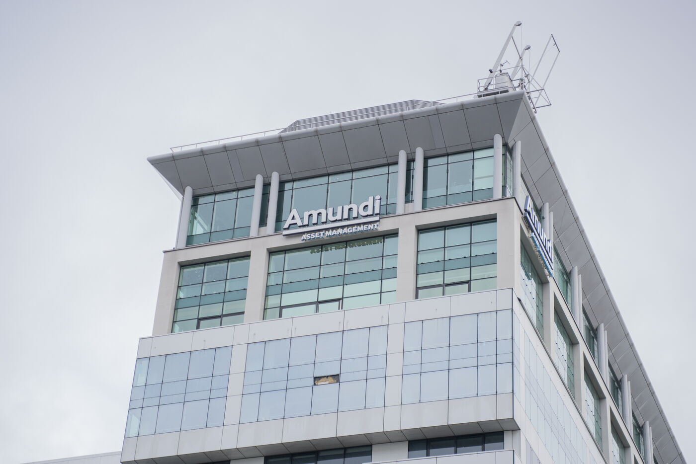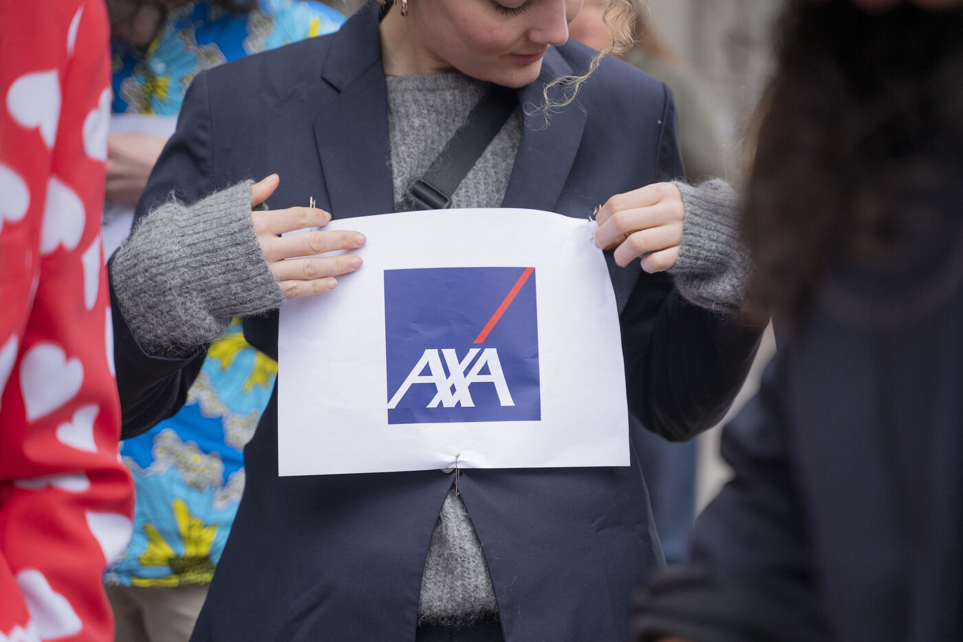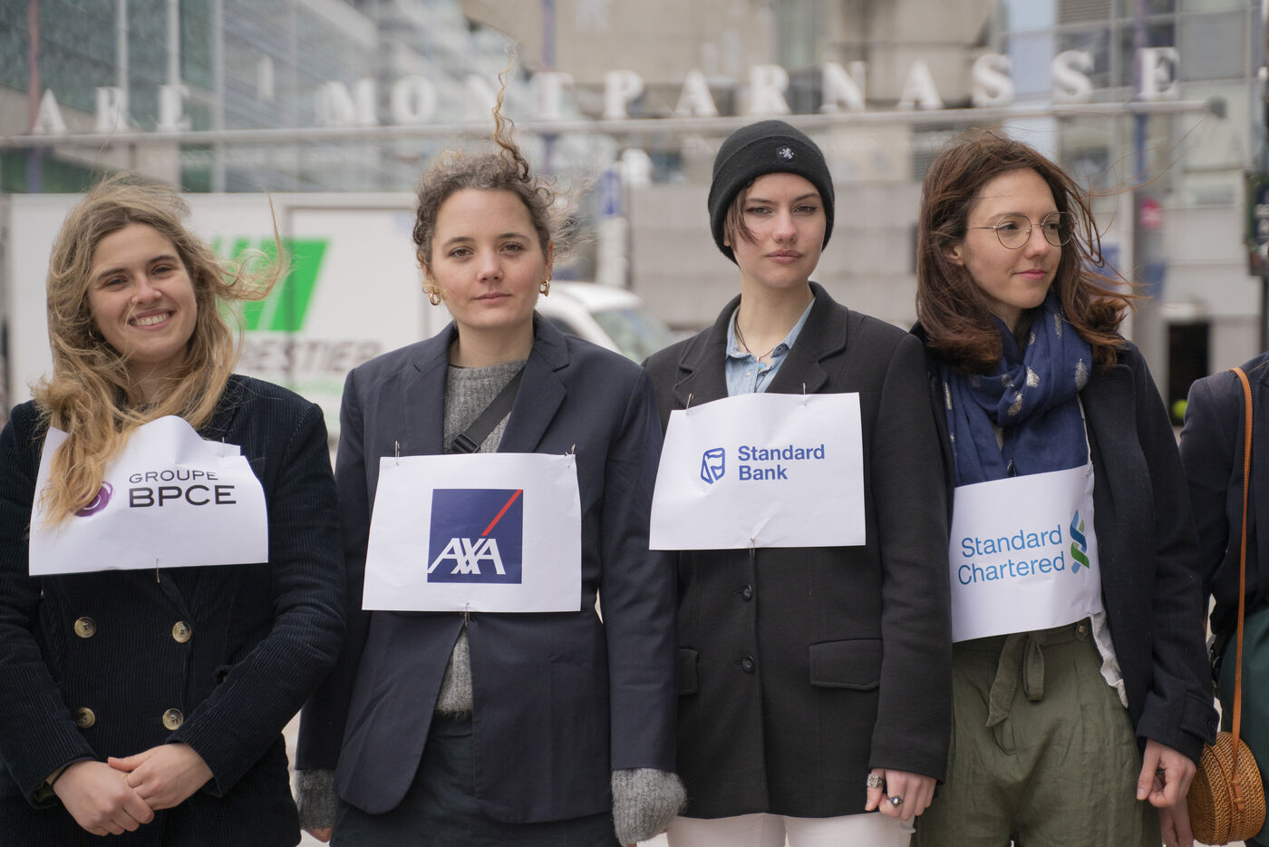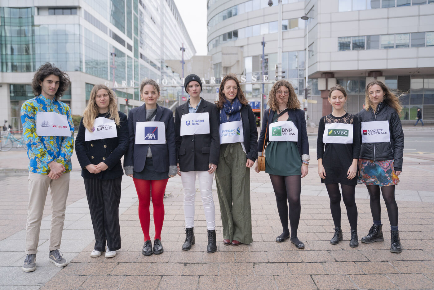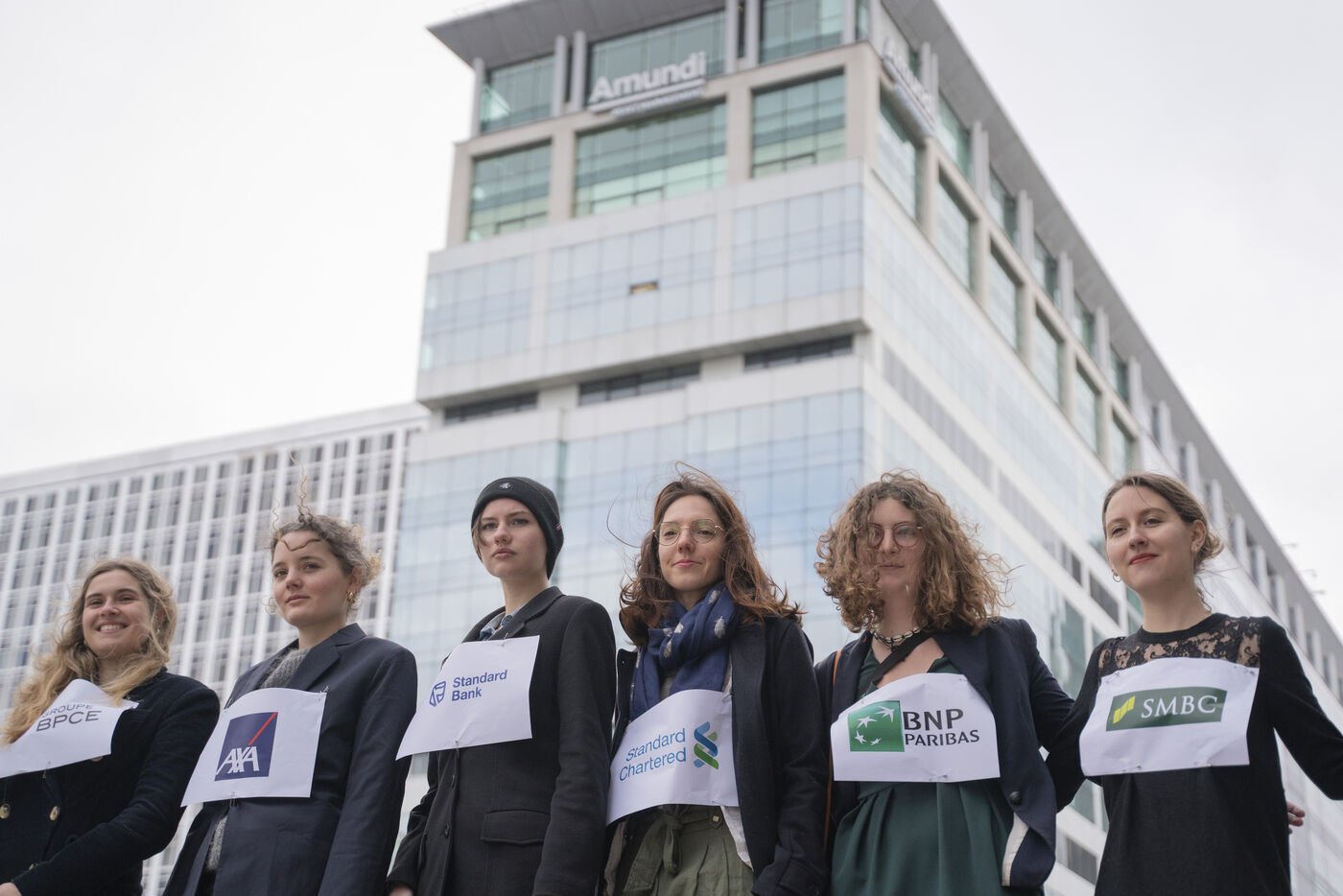 Action du mouvement citoyen StopEacop devant le siège de la société de gestion Amundi, contre le projet EACOP.
