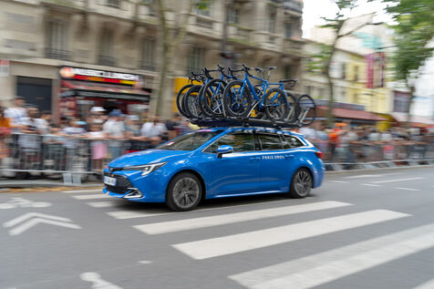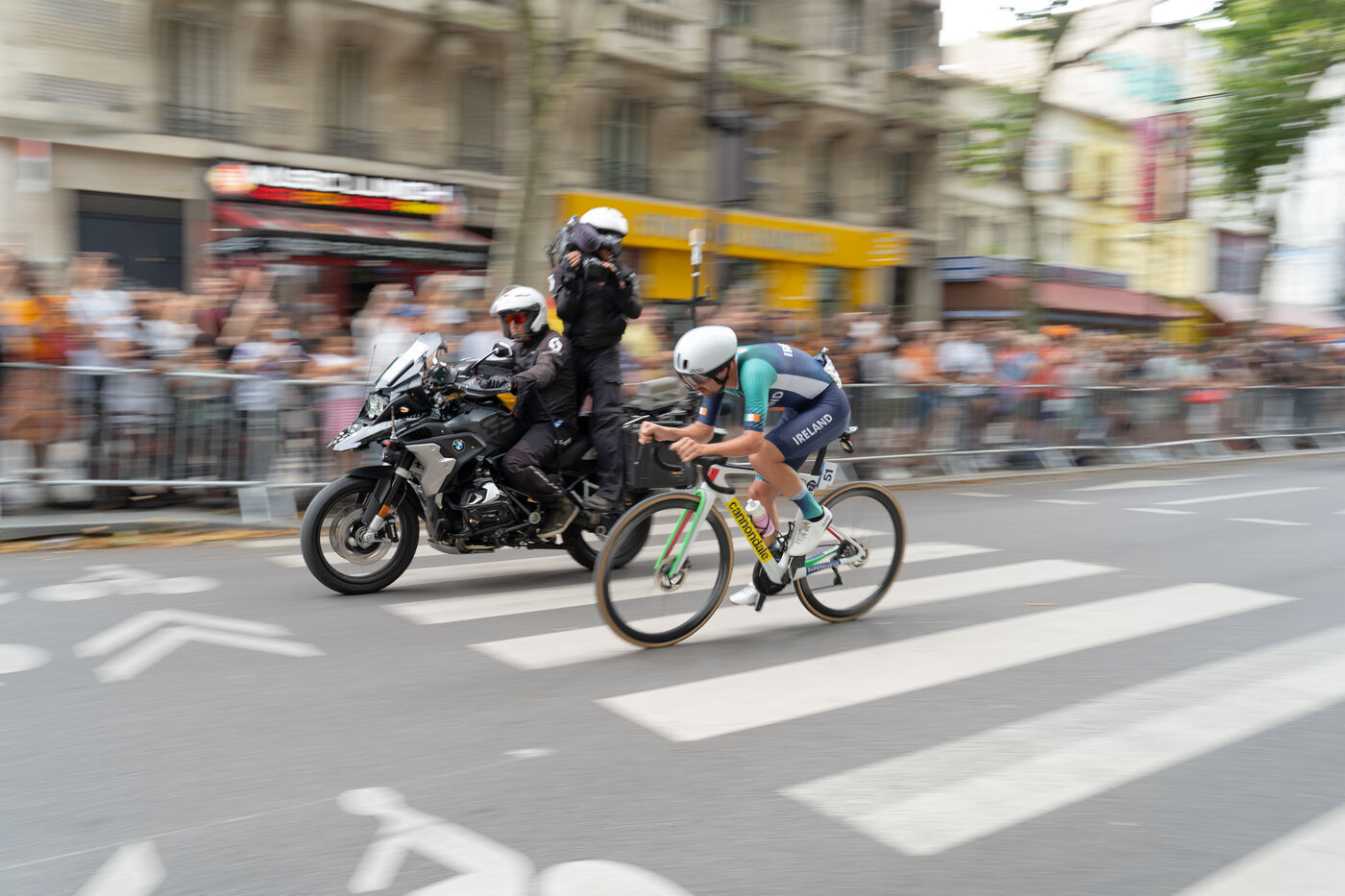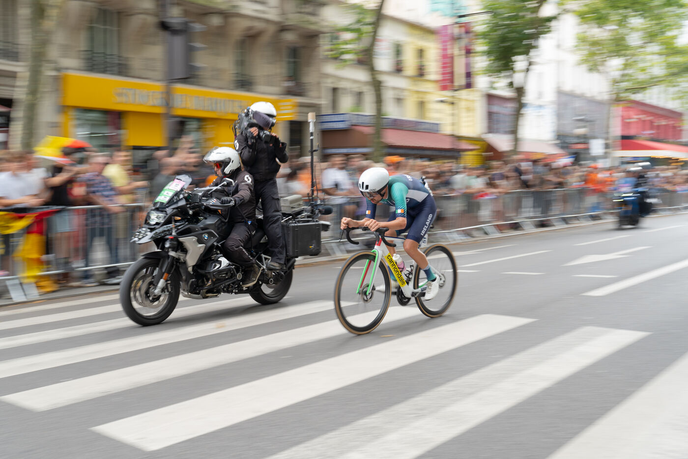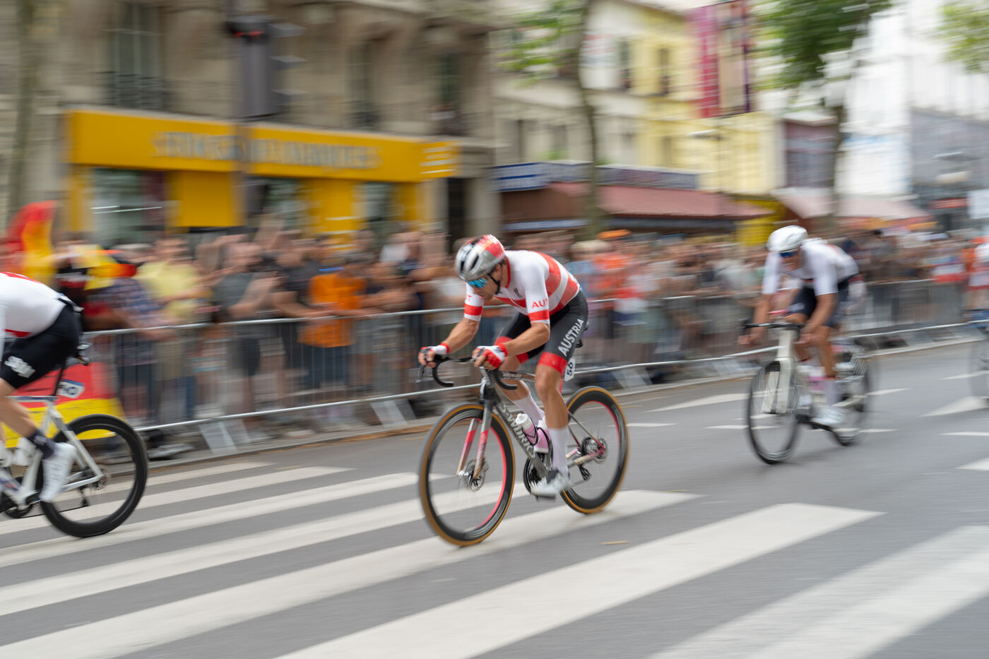 The men's road cycling athletes passed in front of the Parc de la Villette.