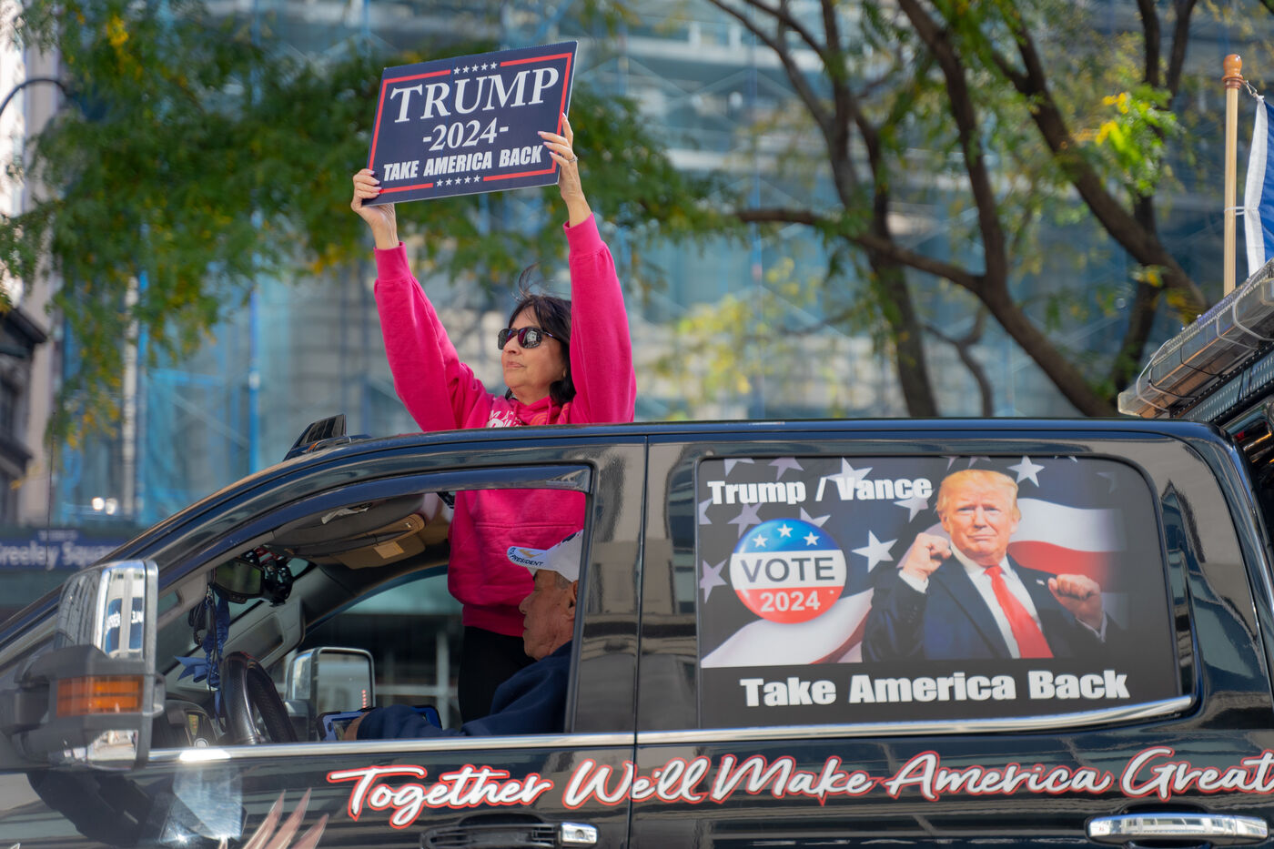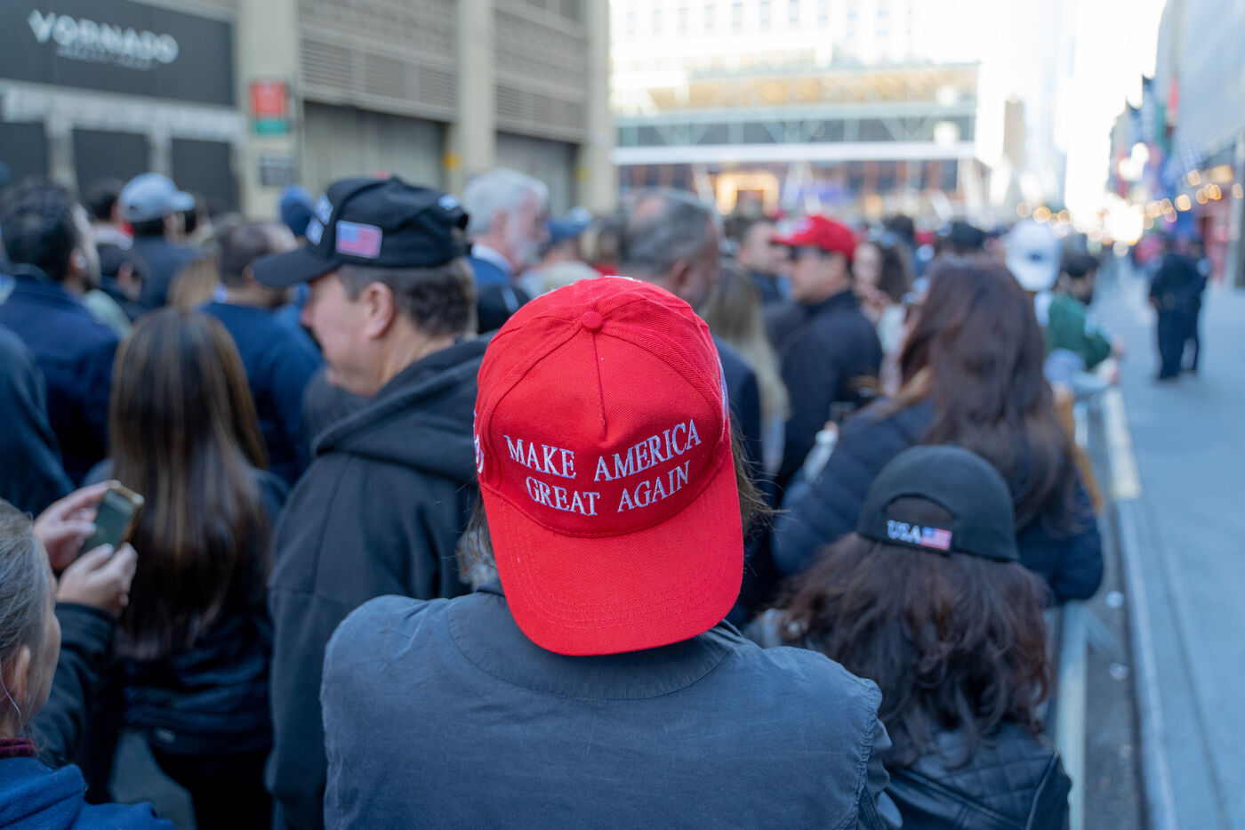Meeting de Trump à New York City au Madison Square Garden, des milliers de supporters sont venus l'écouter et certains n'ayant pas pu avoir de place sont rester à l'extérieur pour promouvoir le candidat, répondre aux interviews de la presse et écouter son discours sur les écrans géants aux alentours de la salle.