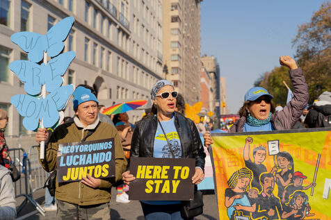 Suite au résultat de élection présidentielle et à l'élection de Donald Trump, le collectif Make the Road New York, suivi d'une trentaine d'associations et de collectifs, ont organisé une manifestation de résistance au deuxième mandat de Donald Trump et pour montrer qu'à New York, les militants continueront de manifester pour les droits des immigrés, des travailleurs, des jeunes, des femmes, de la communauté LGBT+.