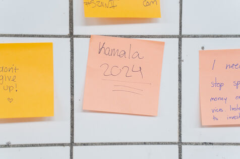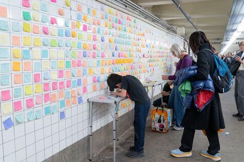Following Donald Trump's presidential victory, Matthew Chavez, the organizer of "Subway Therapy," set up post-it notes in the Manhattan subway corridor (from 14th Street between Sixth and Seventh Avenues) for subway users to use in the hope of freeing them from some of their anxiety.