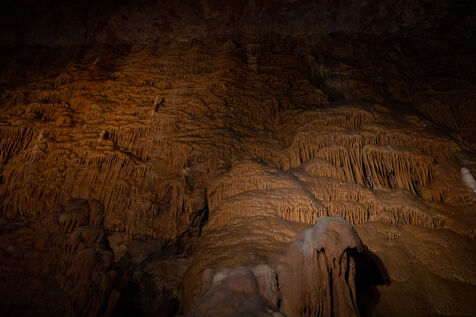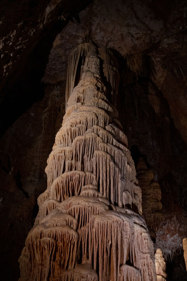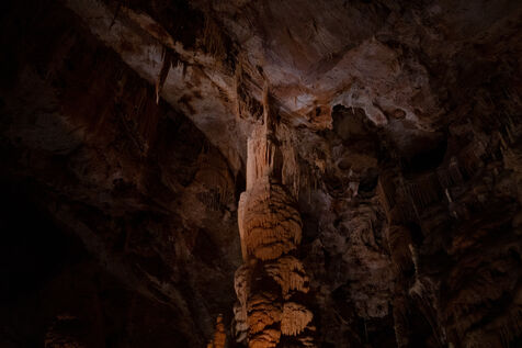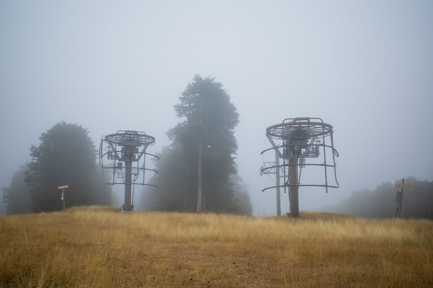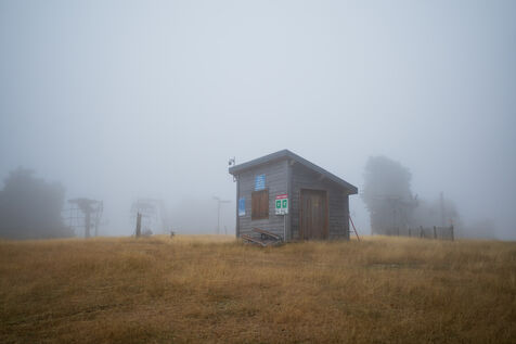 Illustration of landscapes from Lozère, including the Dargilan Cave and the abandoned Alti Aigoual ski resort during summer.