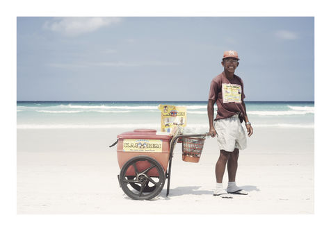 En me promenant sur l'immense plage au sable blanc de Praia do Forte, a Cabo Frio, j'ai fini par poser mon objectif plus sur les gens que sur les paysages, aussi magnifiques soient-ils. Et cela n'a pas manqué d?étonner Valmir, Talia ou Guilherme : si les photographes ne sont pas rares, aucun ne s'était encore intéressé à eux et à leurs chariots. En effet, au Brésil, les vendeurs ambulants font partie du paysage, que ce soit au bord des routes, au coin des rues ou même, comme je le découvrais, sur la plage.