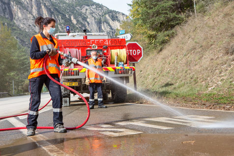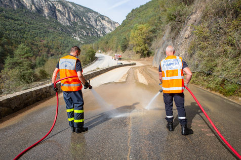 Une equipe restreinte de pompiers volontaires aide la population sinistrée à Clans dans la vallée de la Tinée.