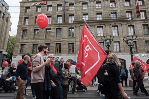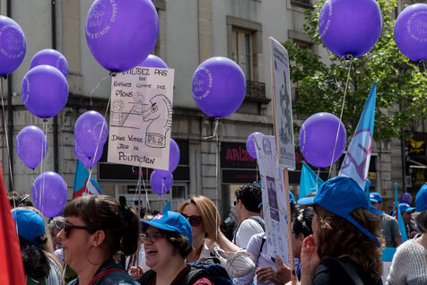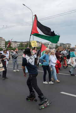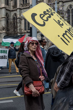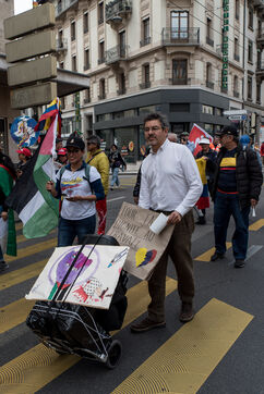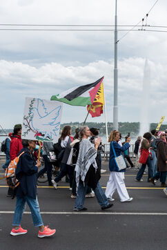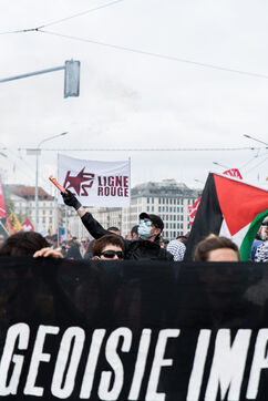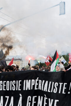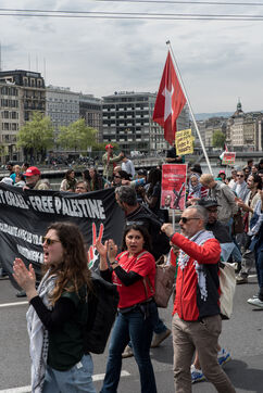 À l'occasion du 1er Mai et de la fête du travail, bien que ce jour ne soit pas férié à Genève en Suisse, la population s'est tout de même réunie pour défiler en cortège et proner diverses revendications. En tête et fin de cortège, un bloc pro-Palestinien très présent.