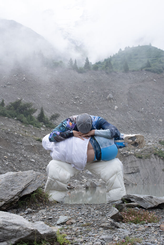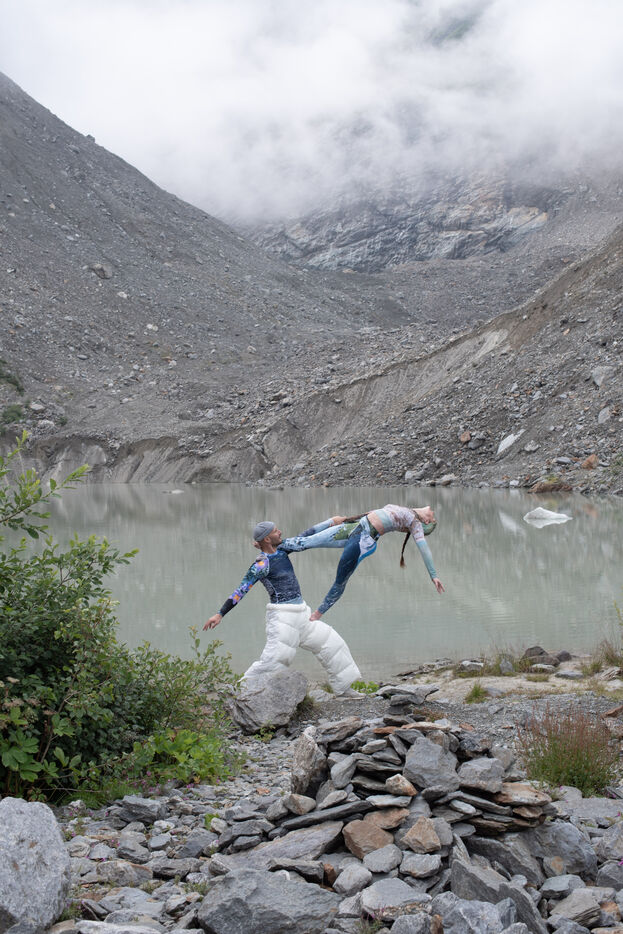 Les glaciers s'effacent (Glaciers are disappearing) is a series of 10 photos highlighting the visible melting of glaciers today. Humans are at once the actors, witnesses and defenders. The SoulMagnet company creates performances committed to climate change with the aim of raising awareness and questioning our human impact on the environment through body movements. At the foot of the post-glacial lake of Bionnassay, they silently express these disappearing glaciers.