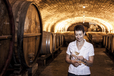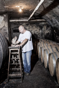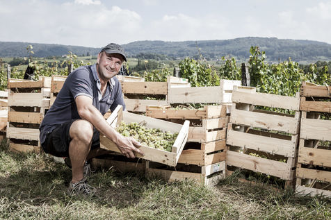 Des vignerons, propriétaires récoltant sur les vignobles du Jura photographiés pour illustrer des articles de magazines.