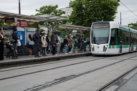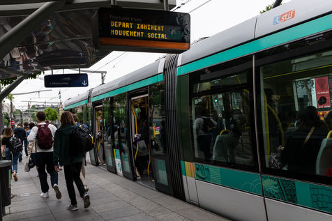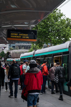 Les trajets de tramway ont ete adaptes. Images des passagers a la connexion entre les tramways T2 et T3 à la porte de Versailles.