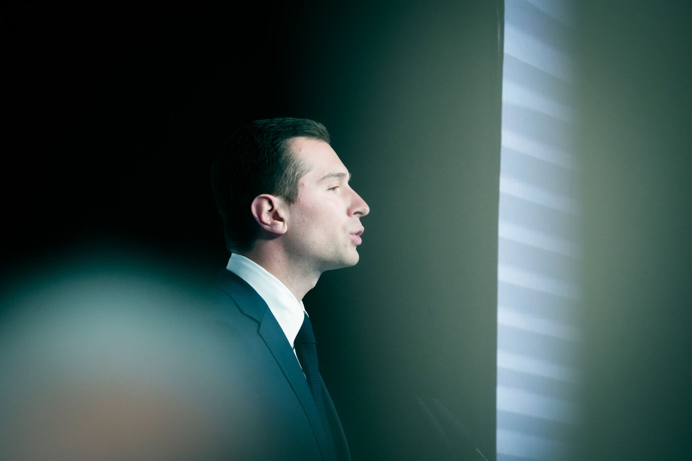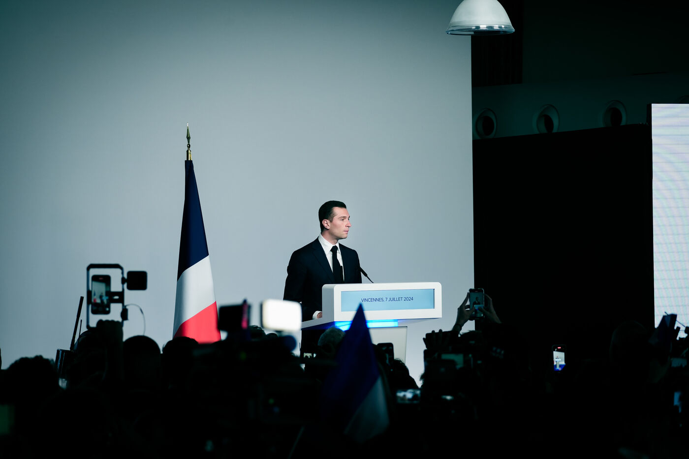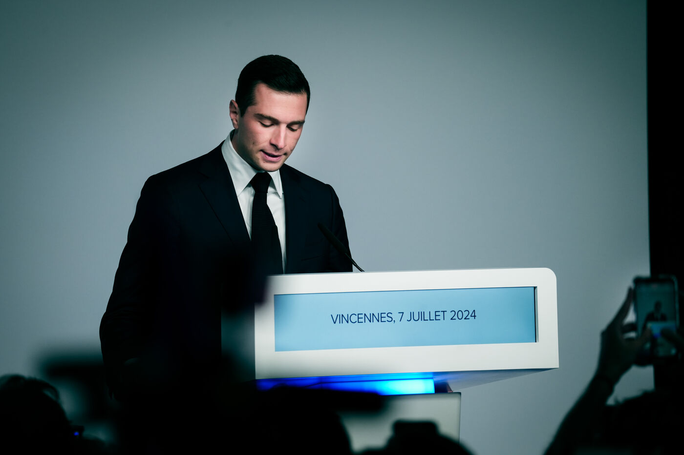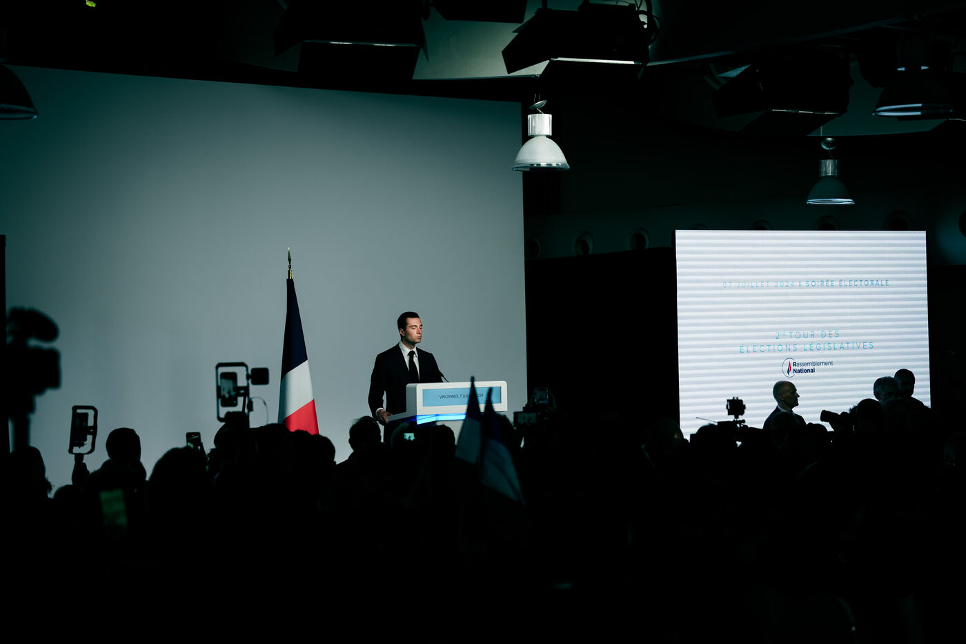Soiree electorale du Rassemblement National avec Jordan Bardella et Marine Le Pen apres le deuxieme tour des elections legislatives, a Paris, France, le 7 juillet 2024.