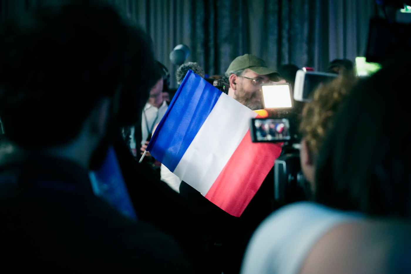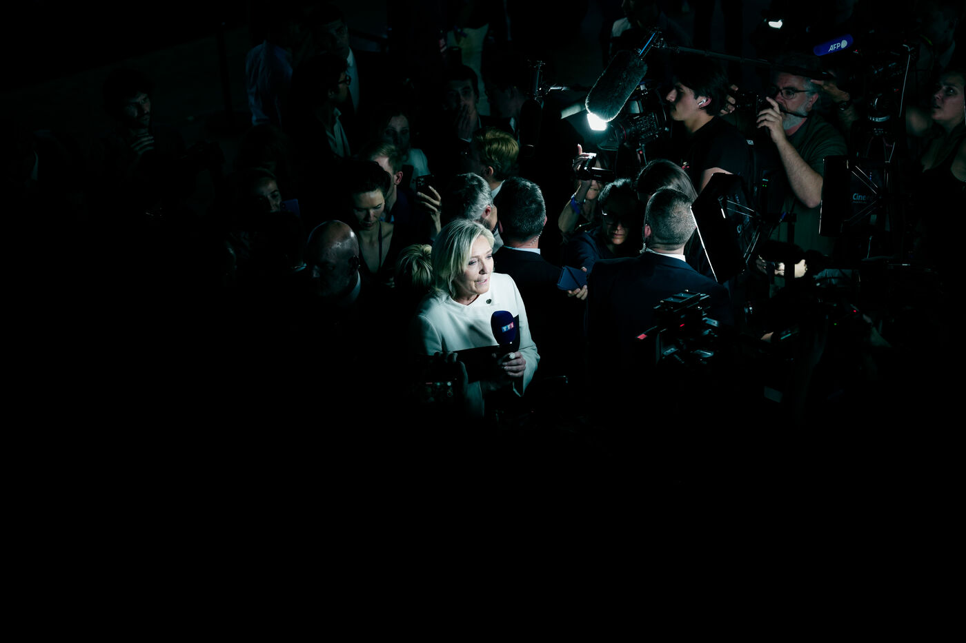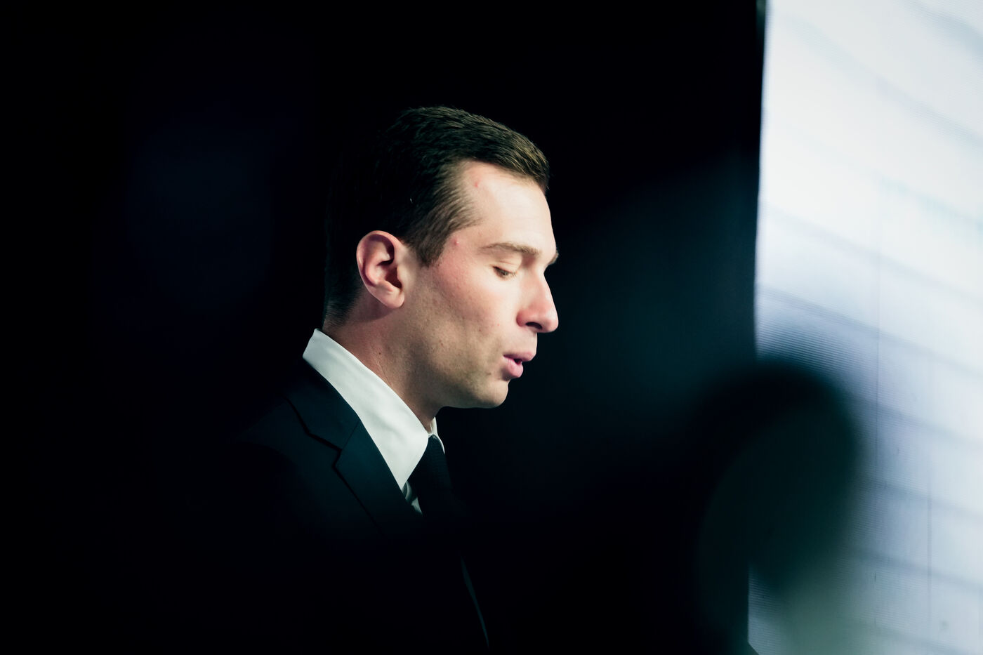 Soiree electorale du Rassemblement National avec Jordan Bardella et Marine Le Pen apres le deuxieme tour des elections legislatives, a Paris, France, le 7 juillet 2024.