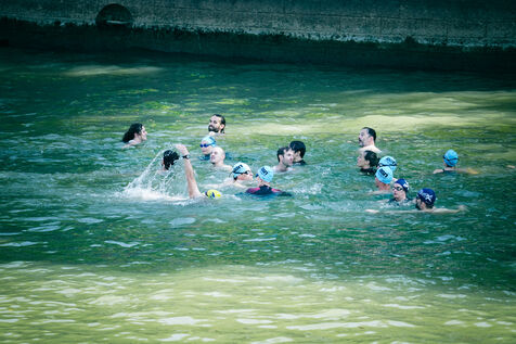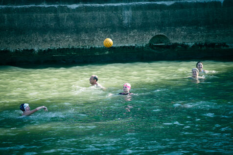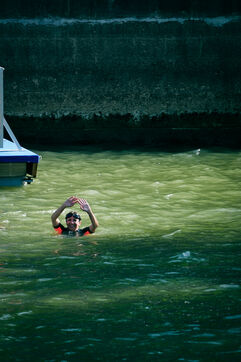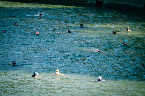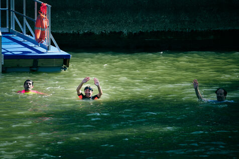 Baignade d Anna Hidalgo, maire de Paris et Tony Estanguet, president du comite d organisation dans la Seine avant des Jeux de Paris 2024 avant le Jeux Olympiques d ete de Paris 2024 a Paris, France, le 17 juillet 2024.