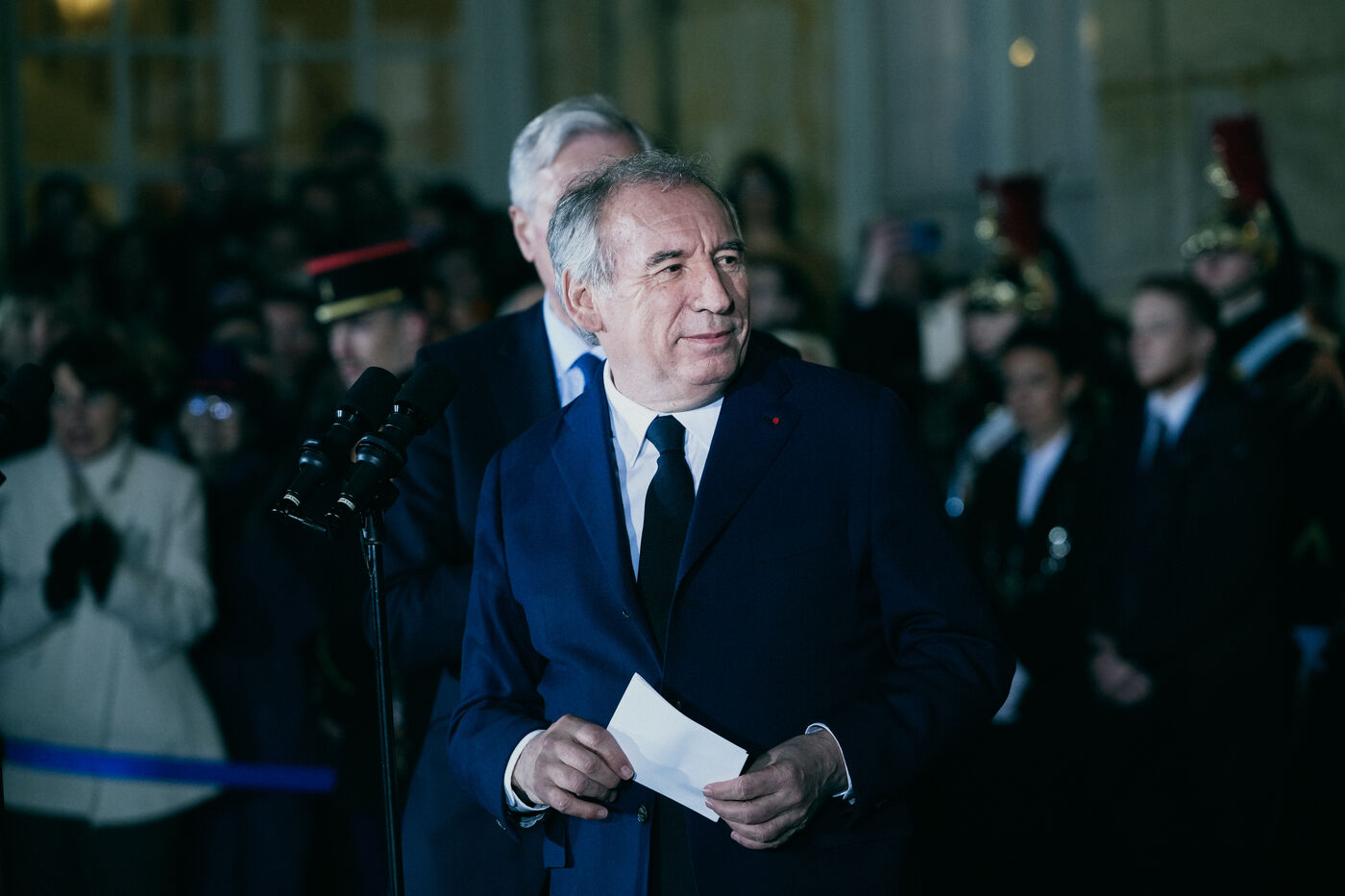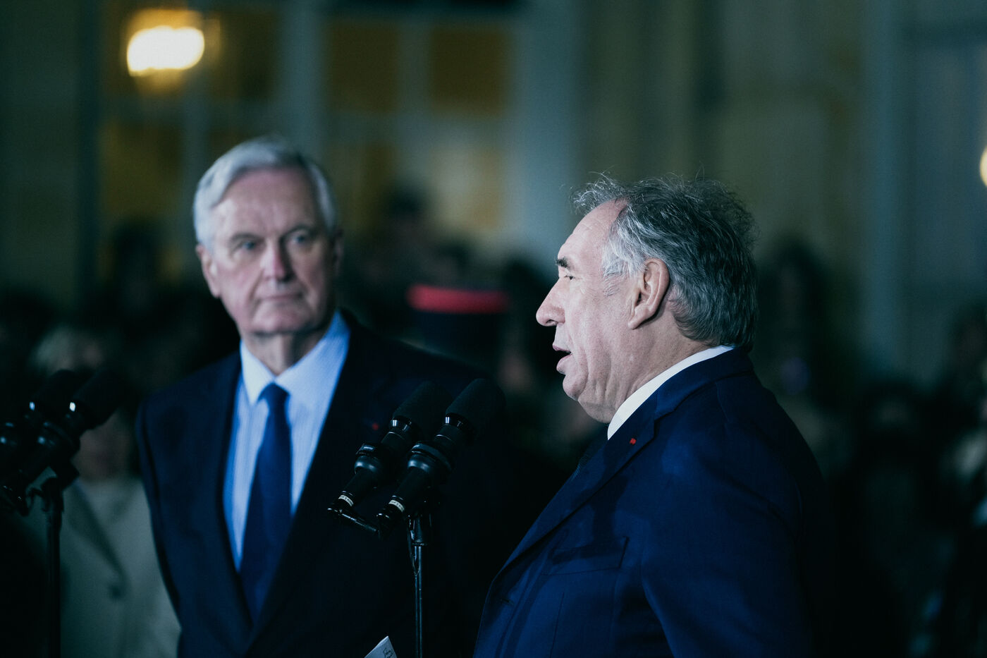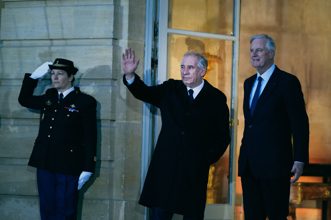 Passation de pouvoir a entre Michel Barnier ancien premier ministre et Francois Bayrou premier ministre a l Hotel de Matignon a Paris en France le 13 decembre 2024.