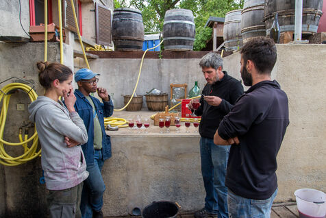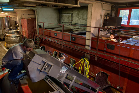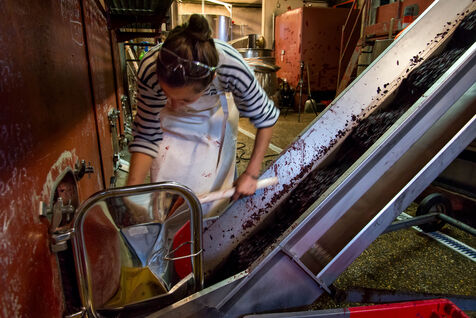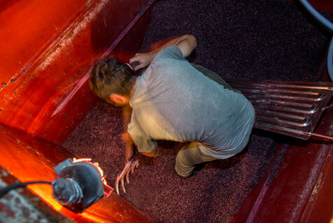 In the cuverie, the grapes are stored with their stalks, skins and seeds. The winemaker lets the grapes make their juice by pressing them with their feet - this is called pigeage, or punching down - to press down the cap of marc and protect it from oxidation. Several times a day, the winemaker monitors the winemaking process, measuring acidity and sugar levels, and especially the work of the indigenous yeasts. All this work is carried out according to the winemaker's choices, and the result he wishes to obtain. After several tastings, the winemaker decides to decant the wine and press it to obtain the final juice to suit his tastes.