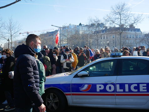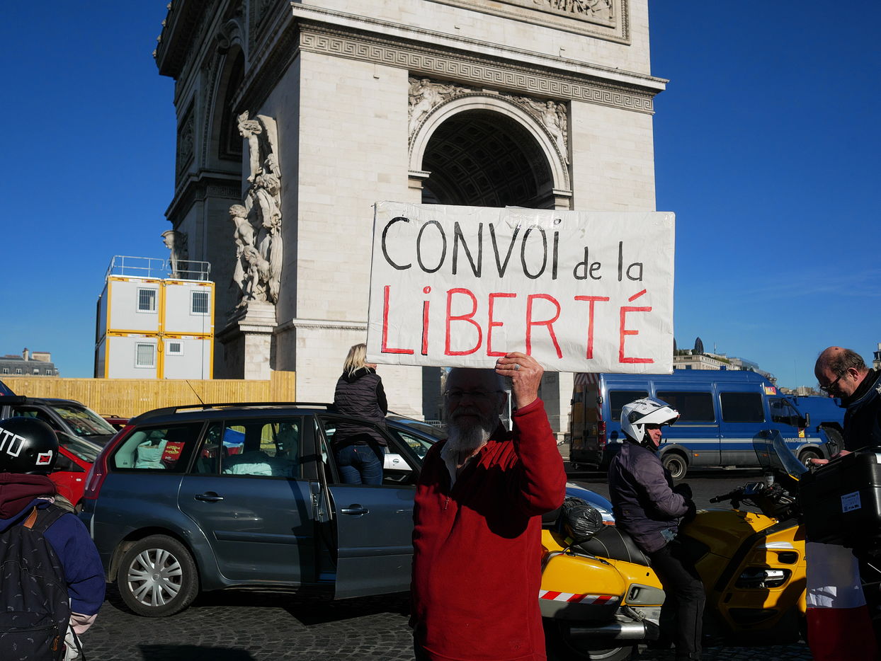 Des participants aux Convoi de la liberté à destination de Bruxelles manifeste Place de l'étoile pour plus d'égalité sociale et contre les atteintes aux libertés engendrées par le pass vaccinal.