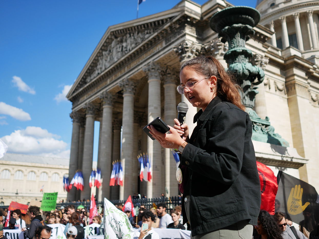 Journée de mobilisation pour la justice climatique à l'appel d'organisations de jeunesse, avec pour revendications « les gens et pas le profit » ou « stop a la publicité dans l'espase public »