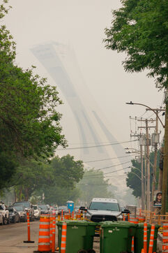 Several hundred km from the blazes, smog and a strong smell of smoke in Montreal, a consequence of the forest fires raging in Quebec. June 25, 2023, Montreal, QC, Canada.
