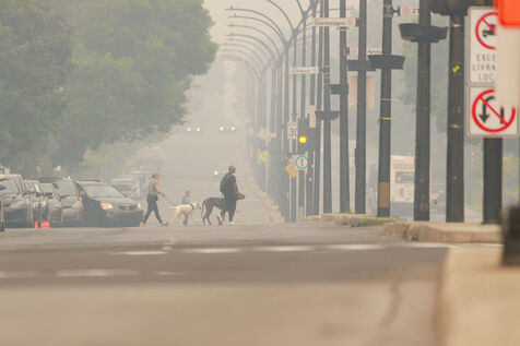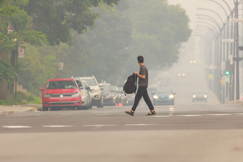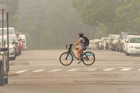 A plusieurs centaines de km des brasiers, smog et forte odeur de fumee à Montreal, consequence des feux de forets qui font rage au Quebec. 25 juin 2023, Montreal, Qc, Canada.