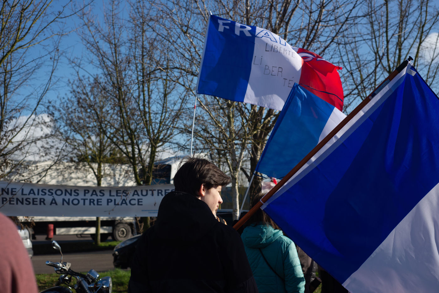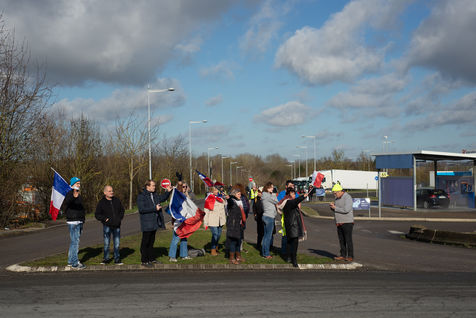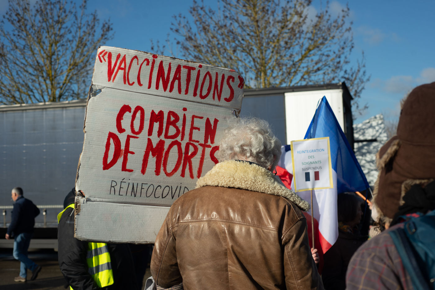 France, Longueau, 2022/02/11. The anti-vax and anti-sanitary pass, following the movement in Canada, have organised several freedom convoys from the four corners of France before meeting in the capital. After their Parisian blockade, they will join other European convoys in Brussels at the beginning of the week. The different convoys from the Hauts de France will gather at longueau near Amiens for a meal before leaving for Paris. Vaccinations, how many dead. Photographs by Delphine Lefebvre/Hans Lucas.