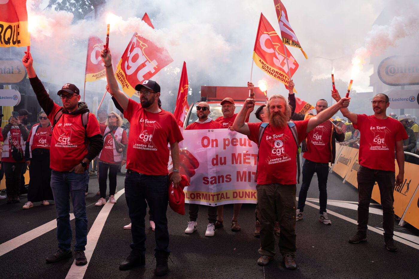 Demonstration by Arcelor Mittal employees in Dunkirk during stage 3 of the Tour de France. A popular and festive gathering organised by the CGT to defend jobs in the steel industry.