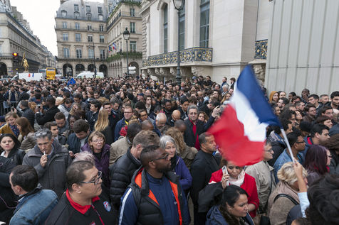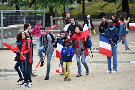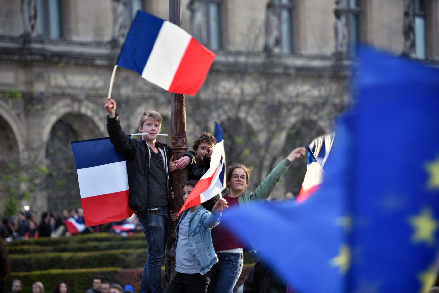 Atmosphere at Louvre Museum courtyard as elected president Emmanuel Macron comes and delivers a speech to his supporters - Paris, France.