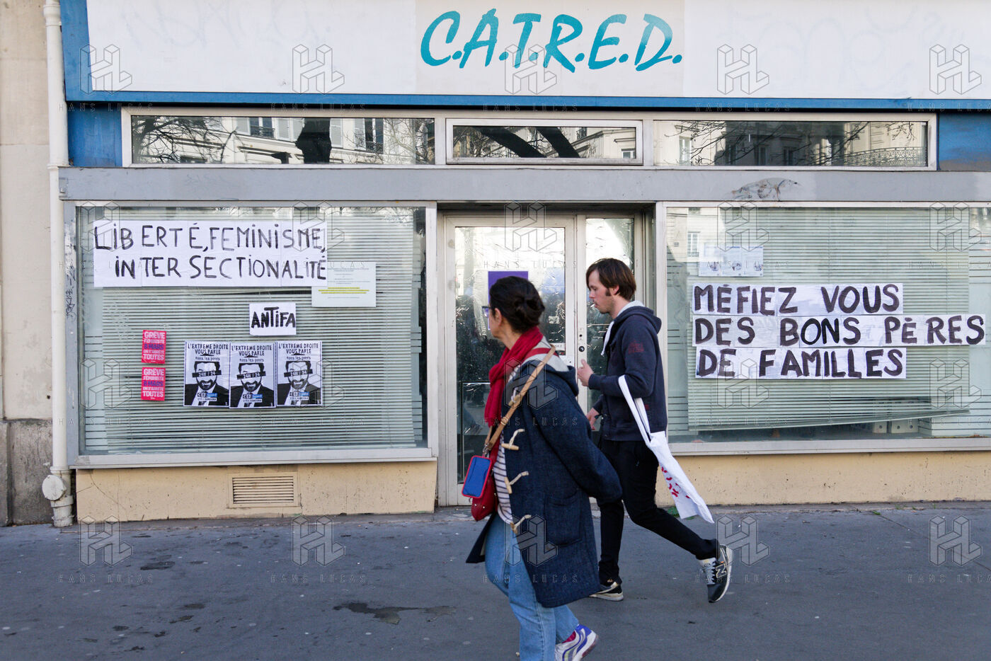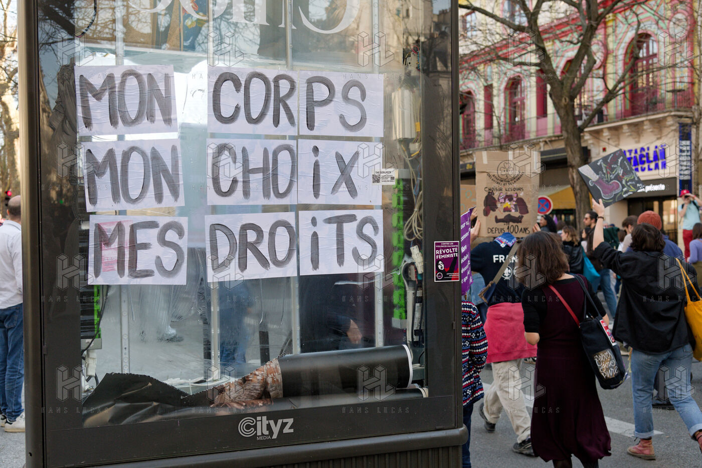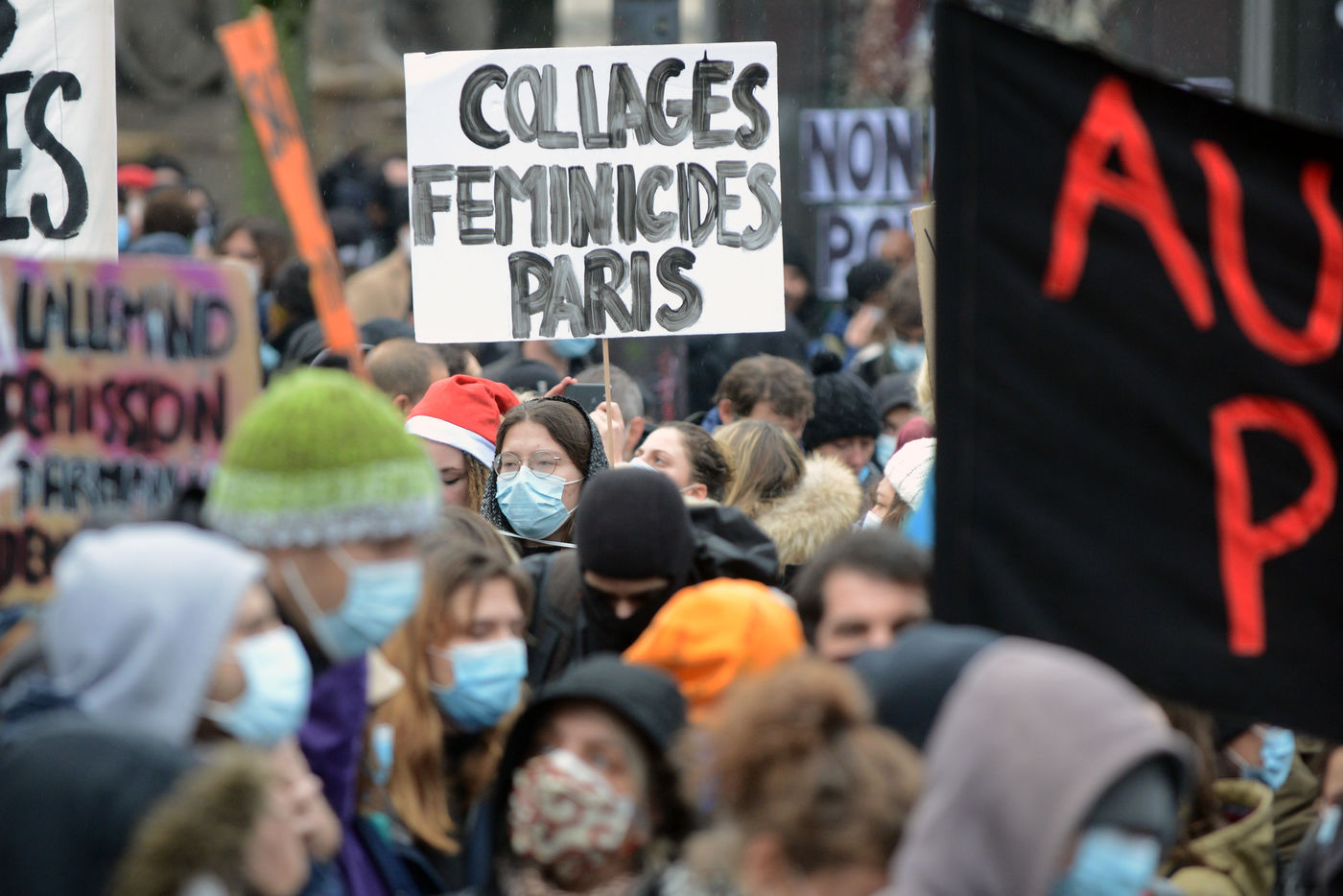 Collages dans les rues dénonçant les féminicides et les violences faites aux femmes à Paris.