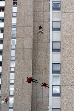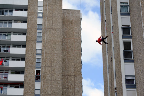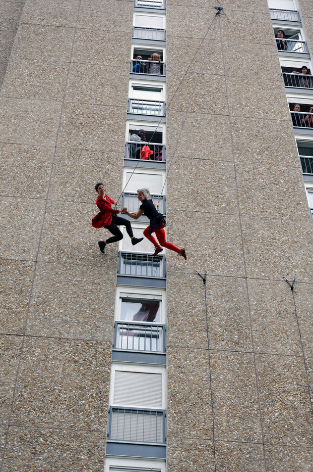 A poetic and spectacular show by the company Les Têtes Bêches on the facade of a 20-storey building in the Sentes district of Les Lilas, accompanied by live music. Born in 2013 in Marseille, the Compagnie Les Têtes Bêches specialises in all-terrain aerial acrobatics, mixing circus techniques, vertical dance, acrobatics and climbing. Their creations are strongly inspired by the location and are readapted for each performance.