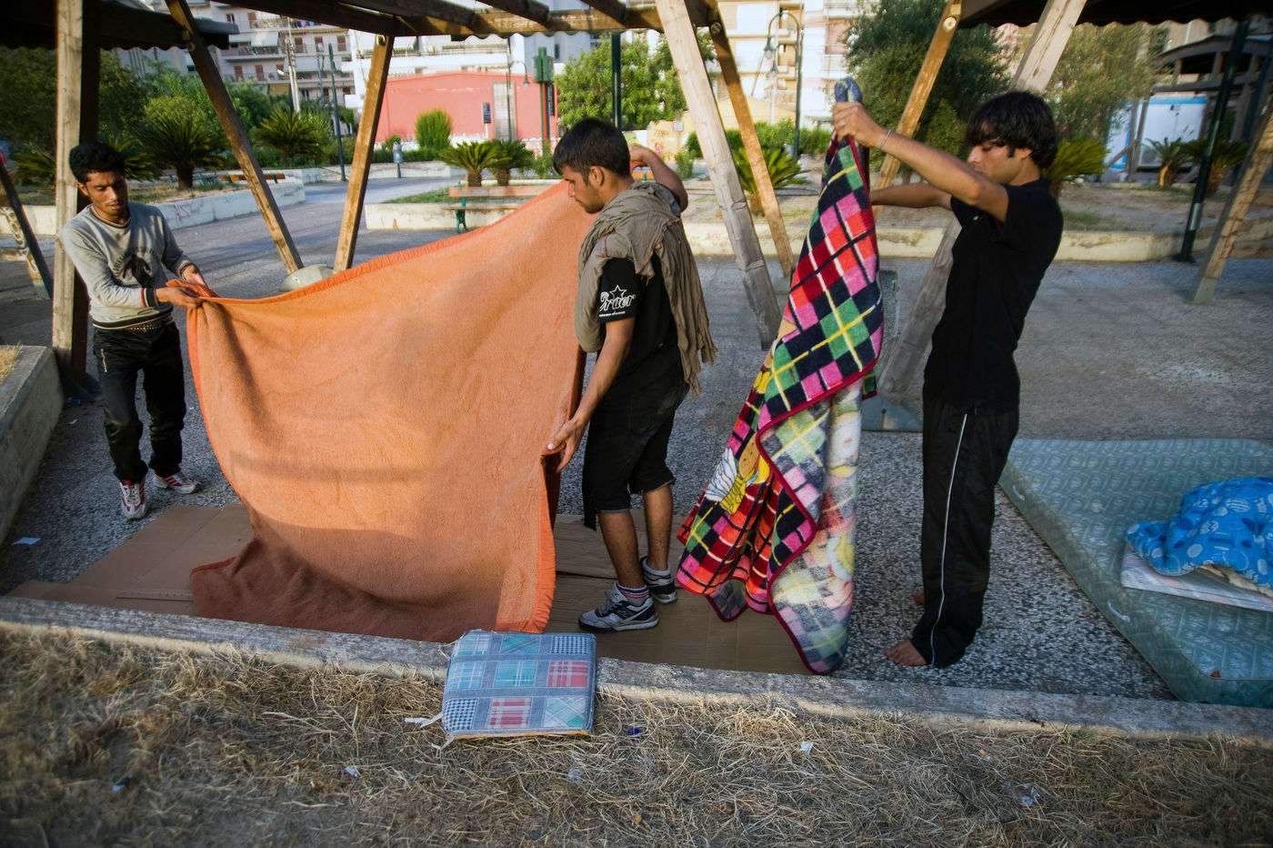 État qui réserve aux afghans un traitement particulièrement dur les demandes de statut de réfugié sont accordées très peu. Ne voulant pas y retourner, ils errent. Patras, grand port de la Grèce occidentale, où transitent chaque jour de nombreux camions vers l'Italie, est devenu un haut lieu de l'immigration clandestine. Des centaines de migrants coincés à Patras. Ils dorment près du port. D'autres sous un vieux train ou encore dans des maisons abandonnées. La journée, un certain nombre d'entre eux cherche à s'introduire a l'intérieur du port et monter dans un ferry en partance pour l'Italie. Les africains (soudanais essentiellement) essaient à l'ouest, à l'extérieur du port, sous ou dans les camions qui entrent dans le port, alors qu'ils stoppent au feu. Les maghrébins (marocains, algériens et tunisiens) et les afghans au niveau de la gare ferroviaire. Chez tous on ressent un mélange de lassitude et d'espoir.