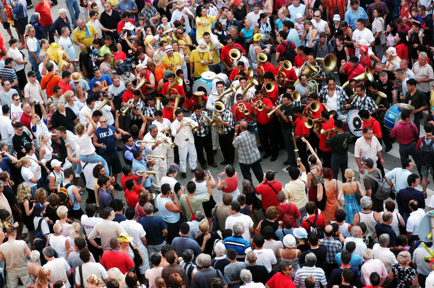 Thus, the village of Guca, located 175 km from Belgrade, with 1500 inhabitants, hosts every August the biggest gathering of brass bands in Europe. For four days, nearly 350,000 spectators come to celebrate and listen to about fifty brass bands. In the restaurants, on the terraces, there are sometimes twenty or thirty musicians playing a few tables apart, trumpets vibrate like a swarm of bumblebees, then unleash their full brass power. If they play louder than the neighbouring band, the musicians will earn more money. When the brass instruments shine, it means that the band is part of the final selection and is practising in public for the last day.
