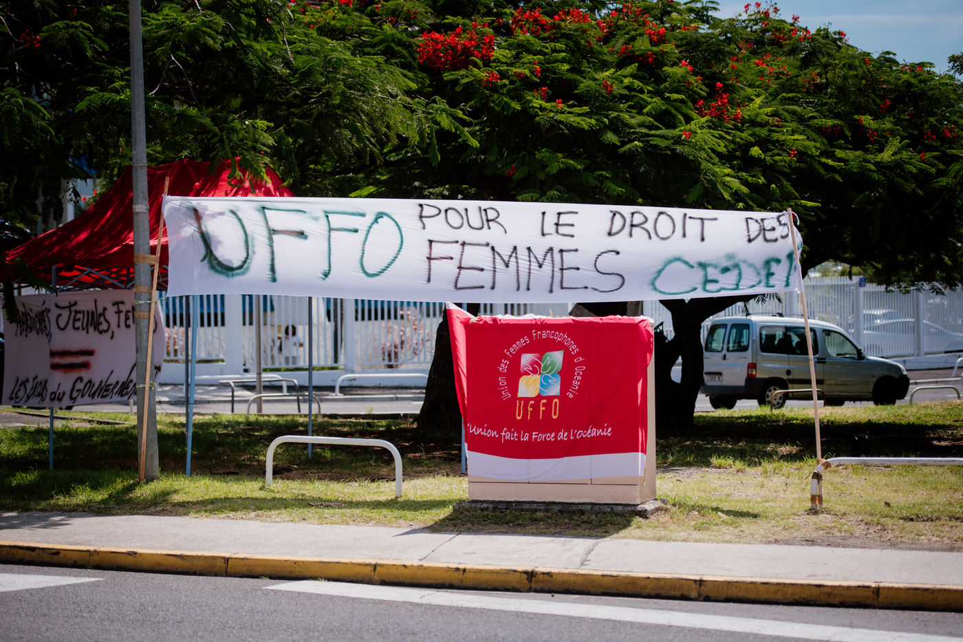 The feminist movements Union des Femmes Francophones d'Océanie (UFFO) and the Collectif des Femmes en Colère (Women in Anger) mobilized in front of the government buildings and the South Province, where the election of the 17th government, which has 11 members, one woman and ten men, is taking place at the same time. The two associations protested against the non-application of the law on parity, which came into force in New Caledonia in 2004.