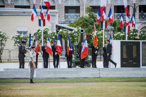 Juillet 2023. Le Président de la République française Emmanuel Macron est en visite officielle en Nouvelle-Calédonie. Il participe à la cérémonie de prise d'armes, place Bir-Hakeim, à Nouméa.