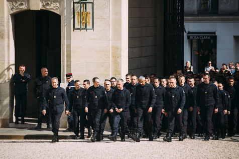 The President of the Republic, Mr Emmanuel MACRON, received at the Palais de l'Elysée, the fire brigades and services mobilised during the fire in Notre-Dame de Paris. This reception was attended by Prime Minister Edouard Philippe, Christophe CASTANER Minister of the Interior, Franck RIESTER Minister of Culture, Laurent NUNEZ, Secretary of State to the Minister of the Interior, and Mrs Florence PARLY, Minister of the Armed Forces, Monsignor Patrick Chauvet, Rector of Notre-Dame de Paris, Anne Hidalgo, Mayor of Paris, Didier Lallement, Prefect of Police of Paris, General Jean-Louis Georgelin, special representative of the President of the Republic for the reconstruction of Notre-Dame de Paris and General Jean-Claude Gallet, Commander of the Sapeurs-pompiers de Paris. Paris, April 18, 2019.
