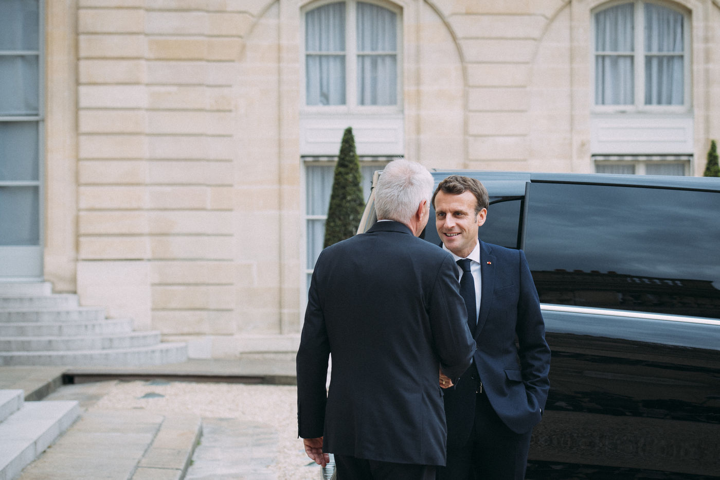 Le chef de l'État, M. Emmanuel Macron, reçoit le secrétaire général du Conseil de l'Europe, le Norvégien Thorbjorn Jagland, et M. David MALPASS, Président du Groupe de la Banque mondiale. Palais de l'Elysée, 6 mai 2019.